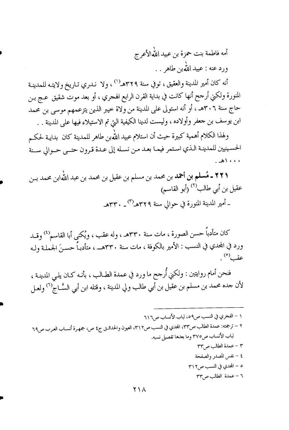1 - الفخري في النسب ص59، لباب الأنساب ص616. 2 - ترجمته: عمدة الطالب ص33، المجدي في النسب ص312، العيون والحدائق ج4، جمهرة أنساب العرب ص69، لباب الأنساب ص375، وما بعدها تفصيل نسبه. 3 - عمدة الطالب ص33. 4 - نفس المصدر والصفحة 5 - المجدي في النسب ص312. 6 - عمدة الطالب ص33.