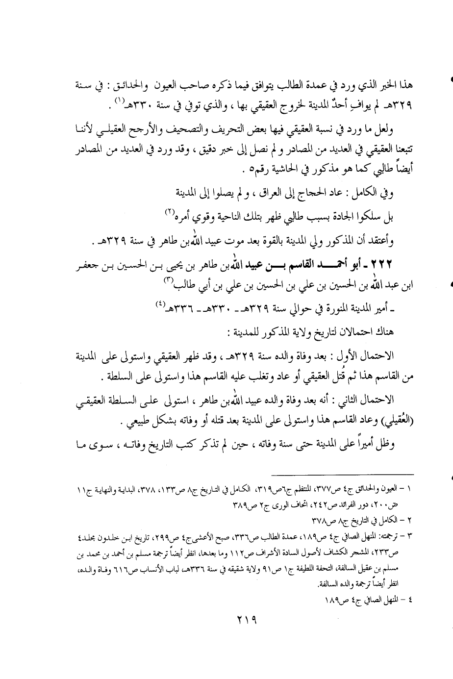 219 ... هذا الخبر الذي ورد في عمدة الطالب يتوافق فيما ذكره صاحب العيون والحدائق: في سنة 329هـ لم يوافِ أحدٌ المدينة لخروج العقيقي بها، والذي توفي في سنة 330هـ (1). ولعل ما ورد في نسبة العقيقي فيها بعض التحريف والتصحيف والأرجح العقيلي لأننا تتبعنا العقيقي في العديد من المصادر ولم نصل إلى خبر دقيق، وقد ورد في العديد من المصادر أيضاً طالبي كما هو مذكور في الحاشية رقم 5. وفي الكامل: عاد الحجاج إلى العراق، ولم يصلوا إلى المدينة. بل سلكوا الجادة بسبب طالبي ظهر بتلك الناحية وقوي أمره (2). وأعتقد أن المذكور ولي المدينة بالقوة بعد موت عبيد الله بن طاهر في سنة 329هـ.
