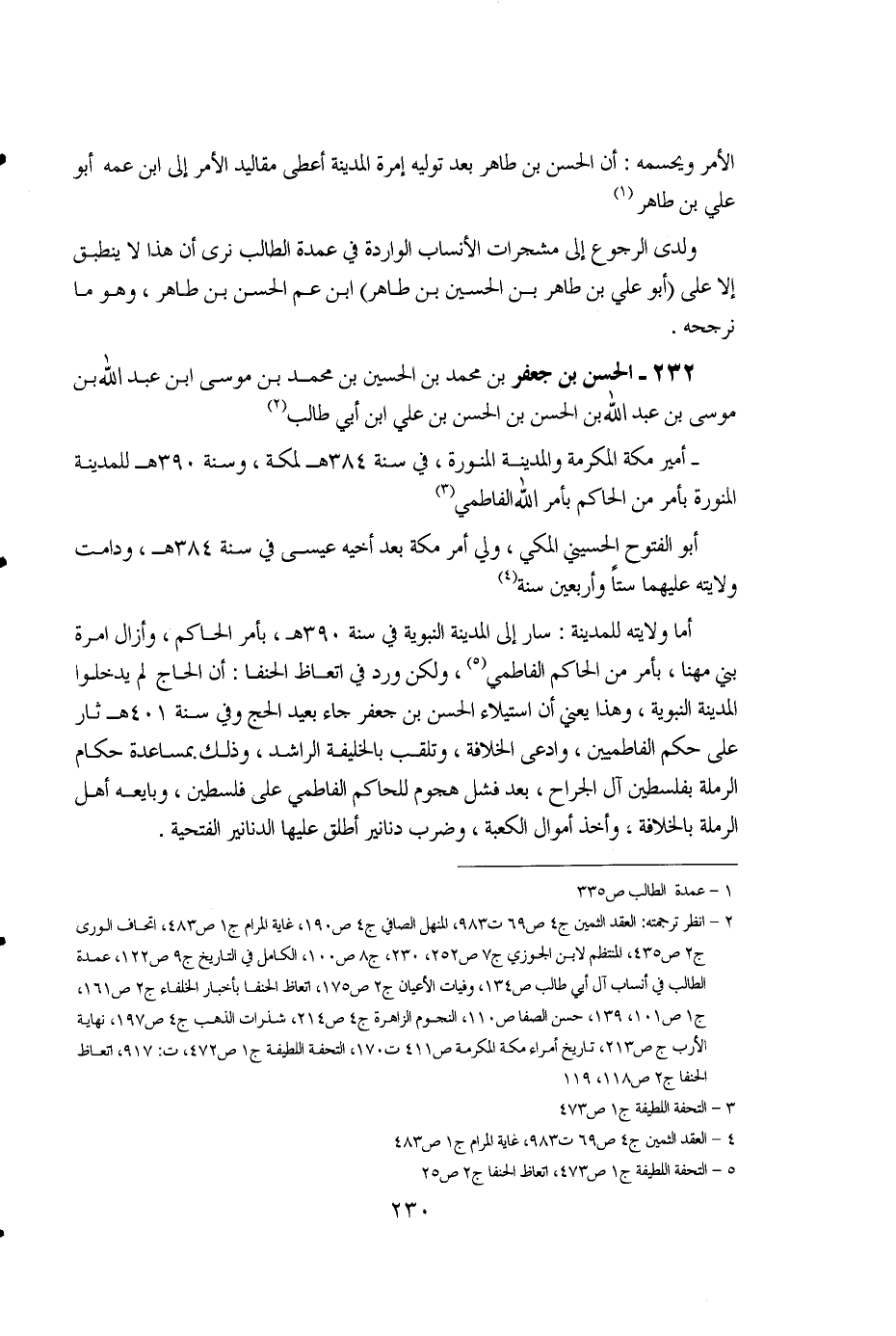 230 ... الأمر ويحسمه: أن الحسن بن طاهر بعد توليه إمرة المدينة أعطى مقاليد الأمر إلى ابن عمه أبو علي بن طاهر (1).