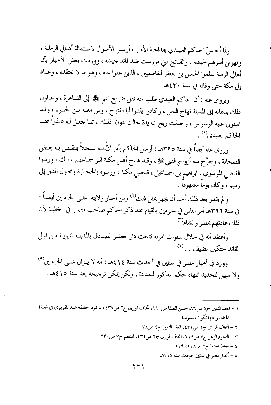 1 - العقد الثمين ج4 ص77، حسن الصفا ص110، اتحاف الورى ج2 ص437، لم ترد الحادثة عند المقريزي في اتعاظ الحنفا، ولعلها تكون مدسوسة. 2 - اتحاف الورى ج2 ص431، العقد الثمين ج4 ص78. 3 - النجوم الزاهر ج4 ص214، اتحاف الورى ج2 ص432، المنتظم ج7 ص230. 4 - التعاظ الحنفا ج2 ص118، 119. 5 - أخبار مصر في سنتين حوادث سنة 414هـ.