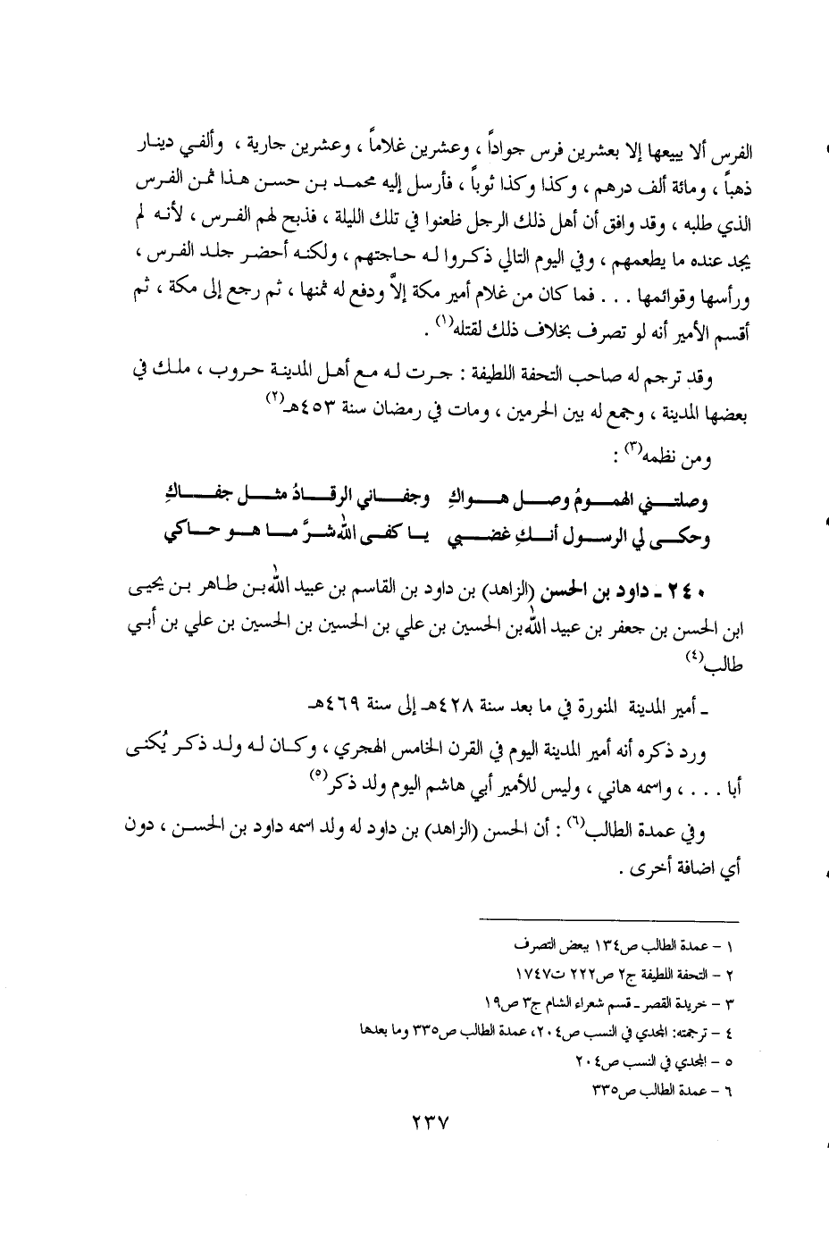 240 - داود بن الحسن (الزاهد) بن داود بن القاسم بن عبيد الله بن طاهر بن يحيى ابن الحسن بن جعفر بن عبيد الله بن الحسين بن علي بن الحسين بن الحسين بن علي بن أبي طالب (4).