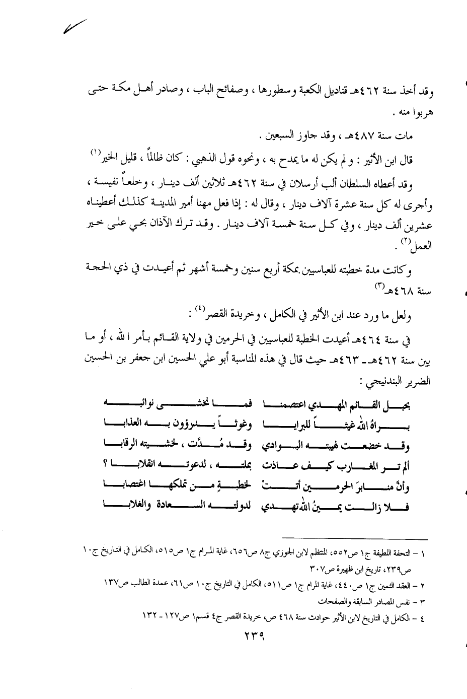 239 ... وقد أخذ سنة 462هـ قناديل الكعبة وسطورها، وصفائح الباب، وصادر أهل مكة حتى هربوا منه. مات سنة 487هـ، وقد جاوز السبعين. قال ابن الأثير: ولم يكن له ما يمدح به، ونحوه قول الذهبي: كان ظالماً، قليل الخير (1) وقد أعطاه السلطان ألب أرسلان في سنة 462هـ ثلاثين ألف دينار، وخلعاً نفيسة، وأجرى له كل سنة عشرة آلاف دينار، وقال له: إذا فعل مهنا أمير المدينة كذلك أعطيناه عشرين ألف دينار، وفي كل سنة خمسة آلاف دينار. وقد ترك الأذان بحي على خير العمل (2). وكانت مدة خطبته للعباسيين بمكة أربع سنين وخمسة أشهر ثم أعيدت في ذي الحجة سنة 468هـ (3). ولعل ما ورد عن ابن الأثير في الكامل، وخريدة القصر (4): في سنة 464هـ أعيدت الخطبة للعباسيين في الحرمين في ولاية القائم بأمر الله، أو ما بين سنة 462هـ - 463هـ حيث قال في هذه المناسبة أبو علي الحسين ابن جعفر بن الحسين الضرير البندنيجي: