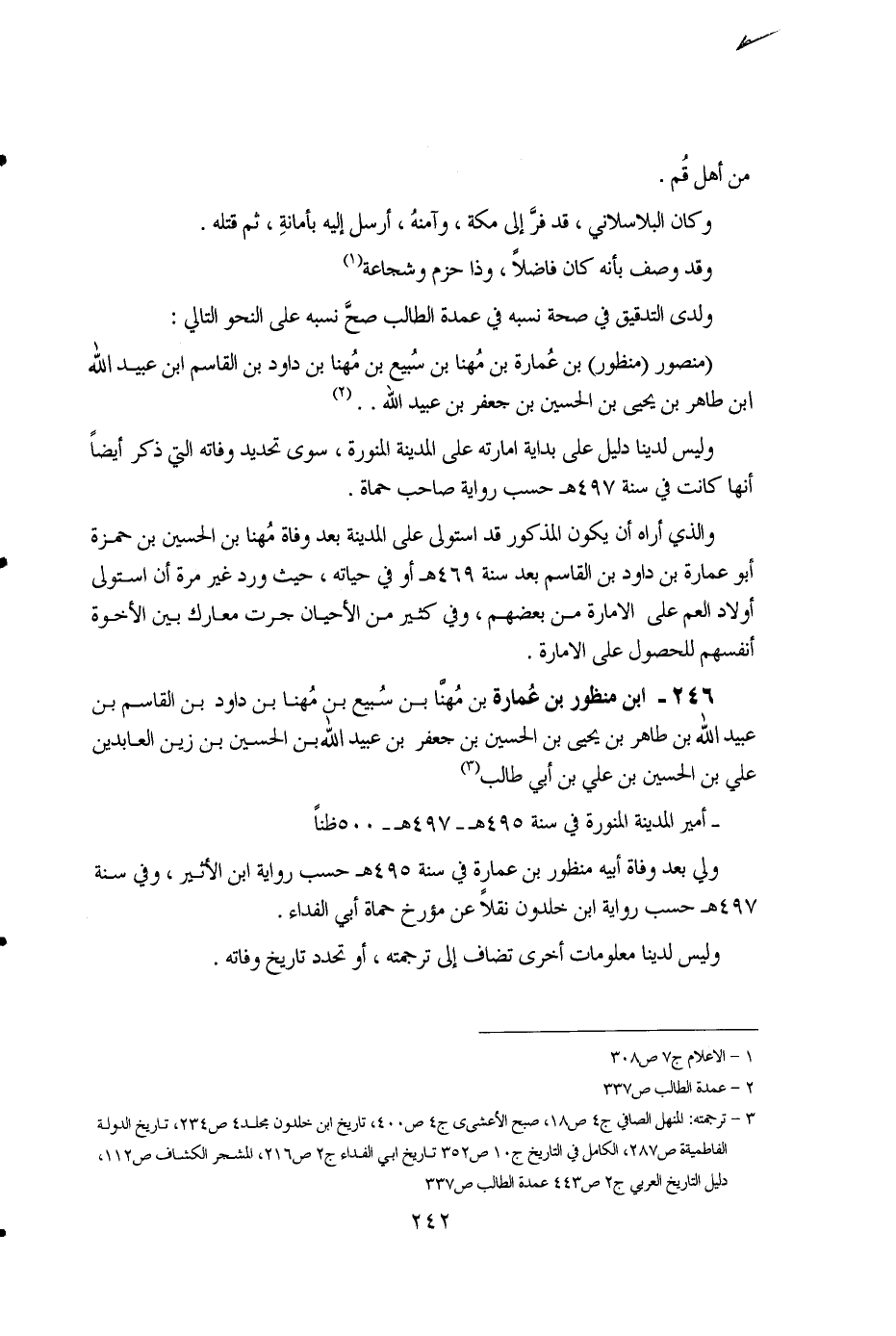246 - ابن منظور بن عُمارة بن مُهنَّا بن سُبيع بن مُهنا بن داود بن القاسم بن عبيد الله بن طاهر بن يحيى بن الحسين بن جعفر بن عبيد الله بن الحسين بن زيد العابدين علي بن الحسين بن علي بن أبي طالب (3).
