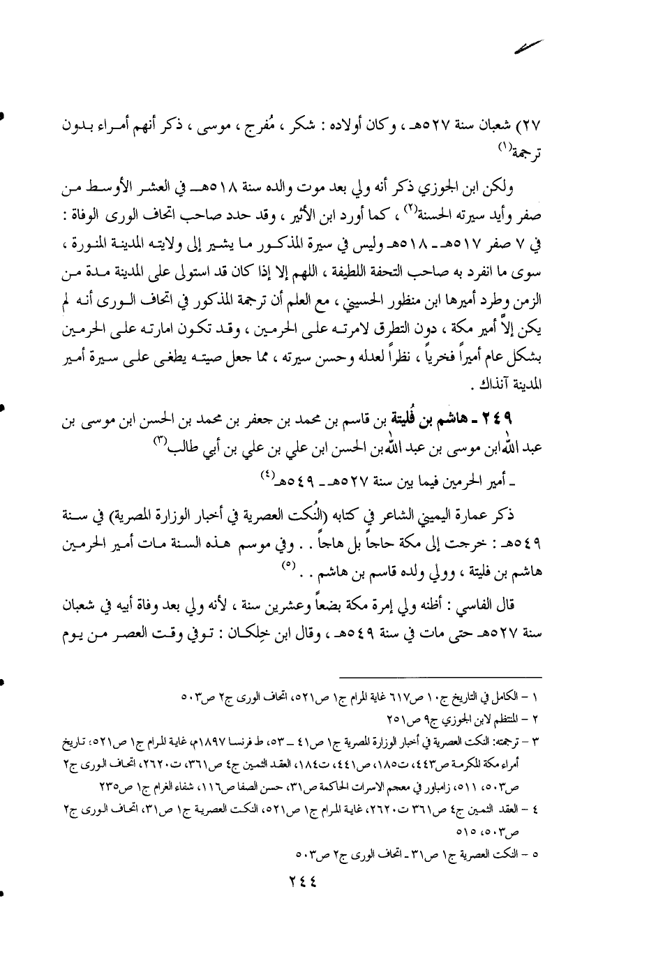 1 - الكامل في التاريخ ج10، ص617، غاية المرام ج1 ص521، اتحاف الورى ج2 ص503. 2 - المنتظم لابن الجوزي ج9 ص251. 3 - ترجمته: النكت العصرية في أخبار الوزارة المصرية ج1 ص41 - 53، ط فرنسا 1897، غاية المرام ج1 ص521، تاريخ أمراء مكة المكرمة ص443، ت185، ص441، العقد الثمين ج4 ص361، ت2620، اتحاف الورى ج2 ص503، 511، زامباور في معجم الأسرات الحاكمة ص31، حسن الصفا ص116، شفاء الغرام ج1 ص235. 4 - العقد الثمين ج4 ص361، ت2620، غاية المرام ج1 ص521، النكت العصرية ج1 ص31، اتحاف الورى ج2 ص503، 515. 5 - النكت العصرية ج1 ص31 - اتحاف الورى ج2 ص503.