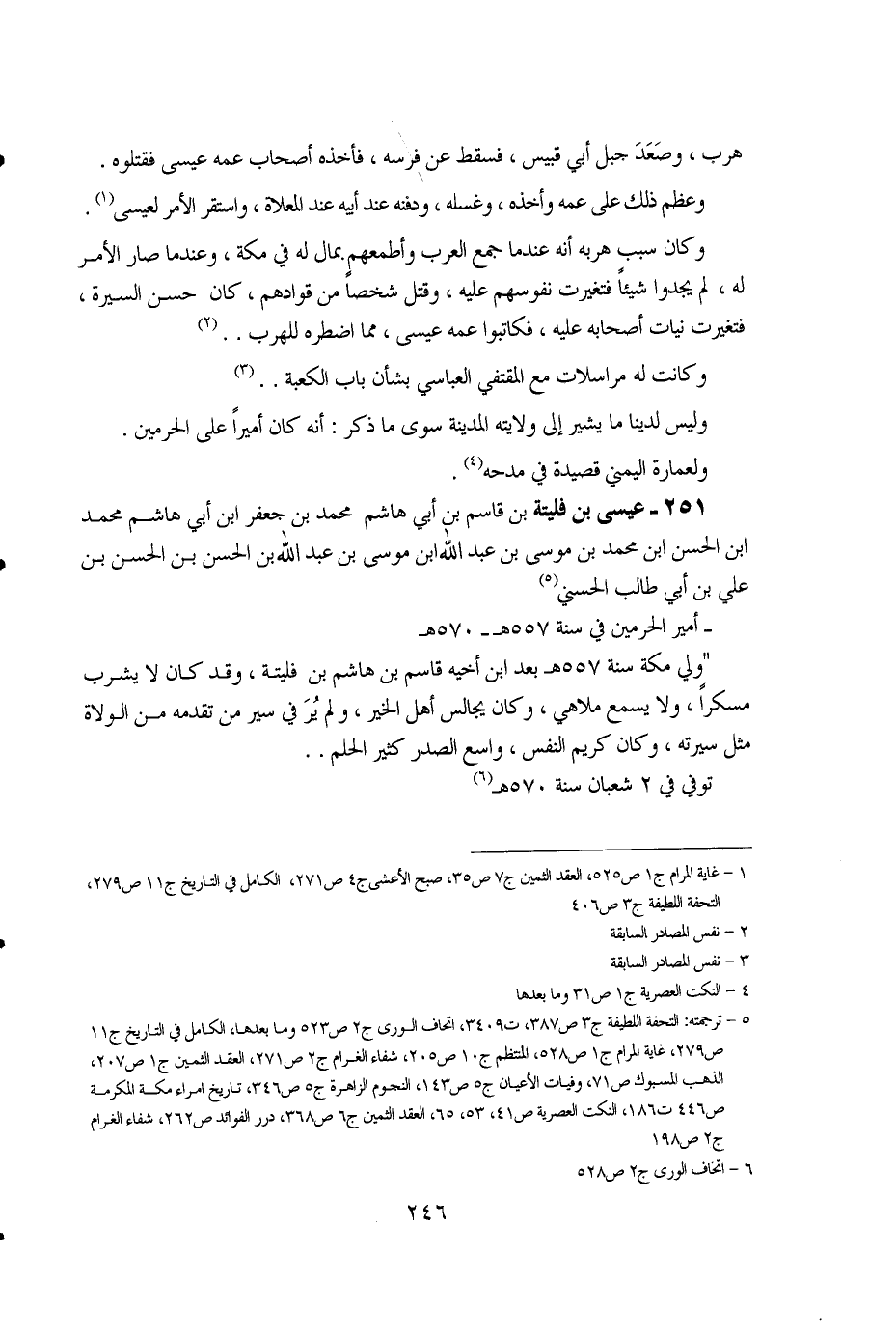 246 ... هرب، وصعد جبل أبي قبيس، فسقط عن فرسه، فأخذه أصحاب عمه عيسى فقتلوه. وعظم ذلك على عمه وأخذه، وغسله، ودفنه عند أبيه عند المعلاة، واستقر الأمر لعيسى (1). وكان سبب هربه أنه عندما جمع العرب وأطمعهم بمال له في مكة، وعندما صار الأمر له، لم يجدوا شيئاً فتغيرت نفوسهم عليه، وقتل شخصاً من قوادهم، كان حسن السيرة، فتغيرت نيات أصحابه عليه، فكاتبوا عمه عيسى، مما اضطره للهرب .. (2). وكانت له مراسلات مع المقتفي العباسي بشأن باب الكعبة .. (3). وليس لدينا ما يشير إلى ولايته المدينة سوى ما ذكر: أنه كان أميراً على الحرمين. ولعمارة اليمني قصيدة في مدحه (4).