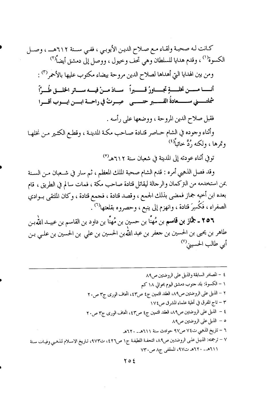 4 - المصار السابقة والذيل على الروضتين ص 89. 1 - الكسوة، بلد جنوب دمشق اليوم بحوالي 18 كم. 2 - الذيل على الروضتين ص 89، العقد الثمين ج 4 ص 43، اتحاف الورى ج 3 ص 20. 3 - تاج المفرق في تحلية علماء المشرق ص 174. 4 - الذيل على الروضتين ص 89، العقد الثمين ج 4 ص 43، اتحاف الورى ج 3 ص 20. 5 - الذيل على الروضتين ص 89. 6 - تاريخ الذهبي ت 74 ص 97، حوادث سنة 611 هـ - 620 هـ. 7 - ترجمته: الذيل على الروضتين ص 89، التحفة اللطيفة ج 1 ص 426، ت 973، تاريخ الإسلام للذهبي وفيات سنة 611 هـ - 620 هـ ت 97، المقفى ج 8 ص 730.