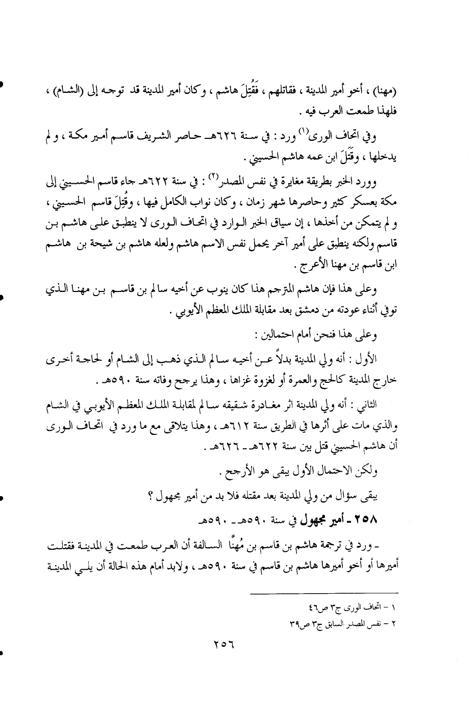 256 ... (مهنا)، أخو أمير المدينة، فقاتلهم، فقُتِلَ هاشم، وكان أمير المدينة قد توجه إلى (الشام)، فلهذا طمعت العرب فيه.