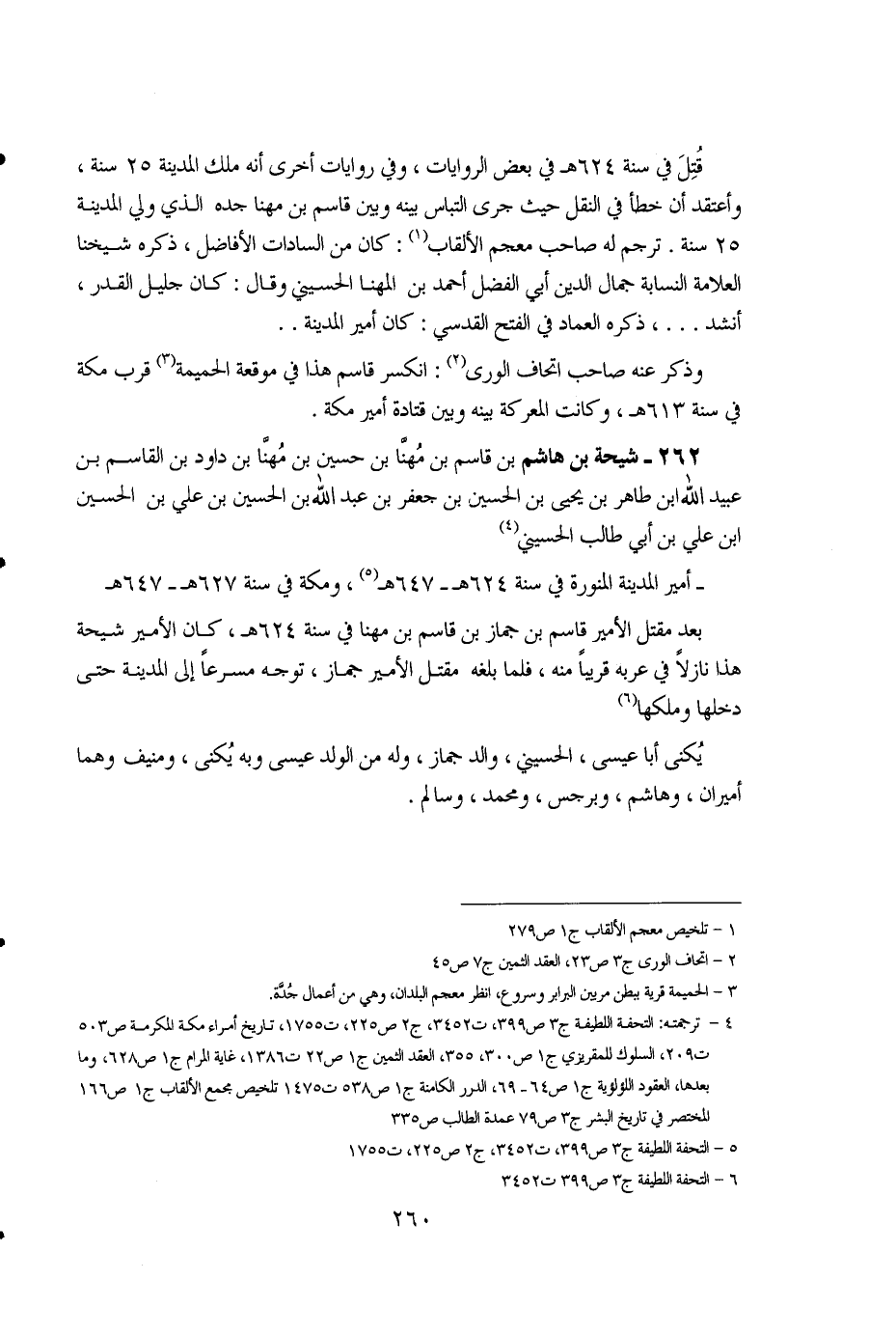 260 ... قتِلَ في سنة 624هـ في بعض الروايات، وفي روايات أخرى أنه ملك المدينة 25 سنة، وأعتقد أن خطأ في النقل حيث جرى التباس بينه وبين قاسم بن مهنا جده الذي ولي المدينة 25سنة، ترجم له صاحب معجم الألقاب (1): كان من السادات الأفاضل، ذكره شيخنا العلامة النسابة جمال الدين أبي الفضل أحمد بن المهنا الحسيني وقال: كان جليل القدر، أنشد .. ، ذكره العماد في الفتح القدسي: كان أمير المدينة .. وذكر عنه صاحب إتحاف الورى (2): انكسر قاسم هذا في موقعة الحميمة (3) قرب مكة في سنة 613هـ، وكانت المعركة بينه وبين قتادة أمير مكة.