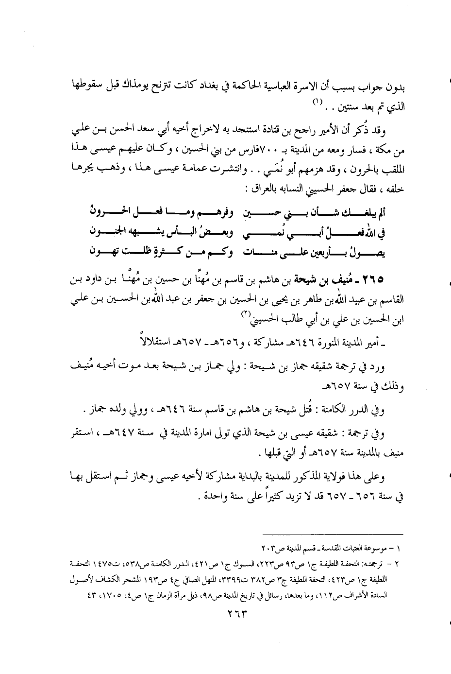 263 ... بدون جواب بسبب أن الأسرة العباسية الحاكمة في بغداد كانت تترنح يومذاك قبل سقوطها الذي تم بعد سنتين .. (1) وقد ذُكر أن الأمير راجح بن قتادة استنجد به لإخراج أخيه أبي سعد الحسن بن علي من مكة، فسار ومعه من المدينة بـ 700 فارس من بني الحسين، وكان عليهم عيسى هذا الملقب بالحرون، وقد هزمهم أبو نُمَي .. وانتشرت عمامة عيسى هذا، وذهب يجرها خلفه، فقال جعفر الحسيني النسابة بالعراق: