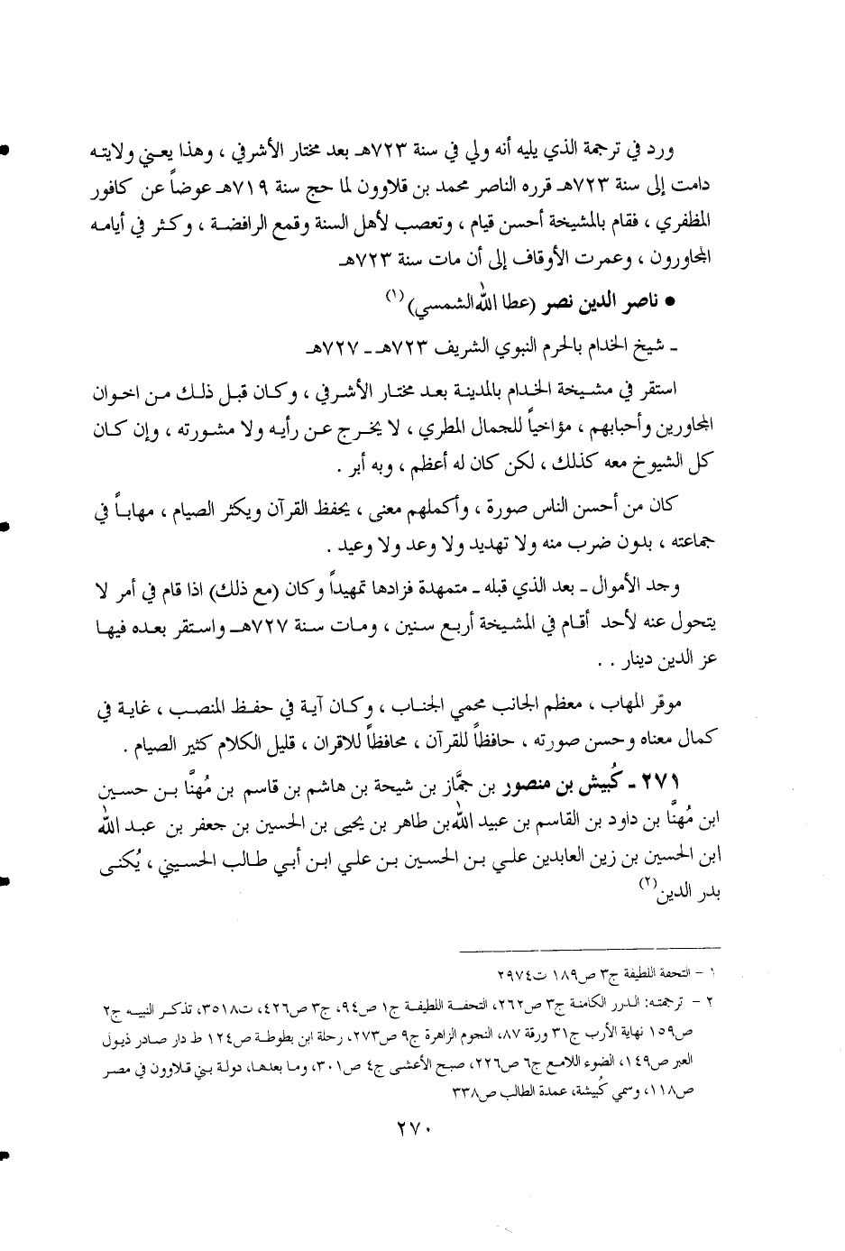 1 - التحفة اللطيفة ج3 ص189، ت2974. 2 - ترجمته: الدرر الكامنة ج3 ص262، التحفة اللطيفة ج1 ص94، ج3 ص426، ت3518، تذكر النبيه ج2 ص159، نهاية الأرب ج32 ورقة 87، النجوم الزاهرة ج9 ص273، رحلة ابن بطوطة ص124، ط دار صادر ذيول العبر ص149، الضوء اللامع ج6 ص226، صبح الأعشى ج4 ص301، وما بعدها، دولة بني قلاوون في مصر ص118، وسمي كُبيشة، عمدة الطالب ص338.