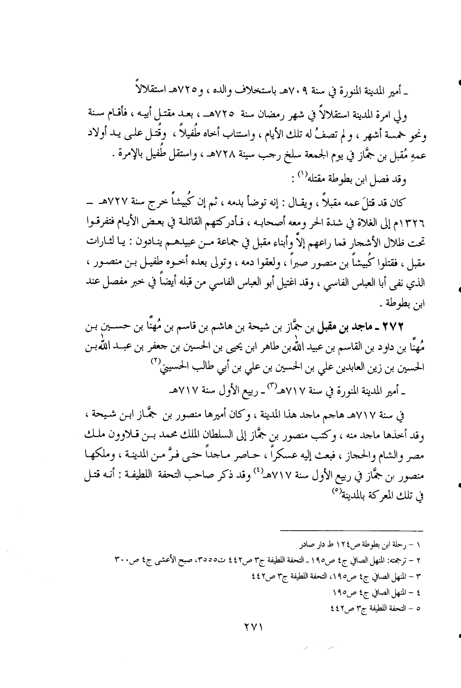 1 - رحلة ابن بطوطة ص124 ط دار صادر. 2 - ترجمته: المنهل الصافي ج4 ص195 - التحفة اللطيفة ج3 ص442، ت3555، صبح الأعشى ج4 ص300. 3 - المنهل الصافي ج4 ص195، التحفة اللطيفة ج3 ص442. 4 - المنهل الصافي ج4 ص195. 5 - التحفة اللطيفة ج3 ص442.