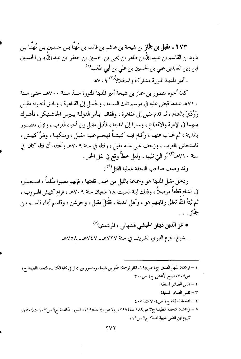 1 - ترجمته: المنهل الصافي ج4 ص195، انظر ترجمة: جمّاز بن شيمة، ومنصور بن جماز في ثنايا الكتاب، التحفة اللطيفة ج1 ص704، صبح الأعشى ج4 ص300. 2 - نفس المصادر السابقة. 3 - نفس المصادر السابقة. 4 - التحفة اللطيفة ج1 ص704 ت4059. 5 - ترجمته: التحفة اللطيفة ج3 ص189، ت2974، ج2 ص40 ت1195، الدرر الكامنة ج2 ص103، ت1704، تاريخ ابن قاضي شهبة مجلد 3 ص169.