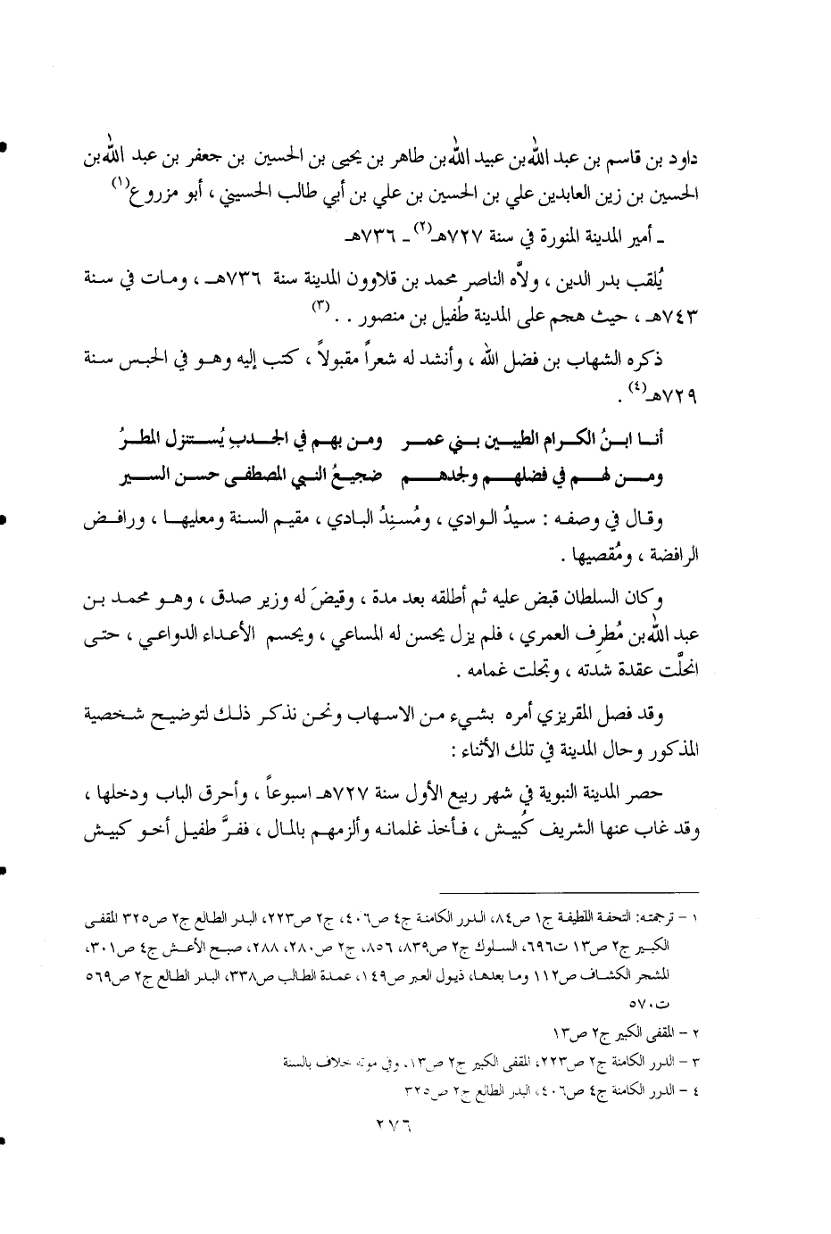 1 - ترجمته: التحفة اللطيفة ج1 ص84، الدرر الكامنة ج4 ص406، ج2 ص223، البدر الطالع ج2 ص325، المقفى الكير ج2 ص13، ت696، السلوك ج2 ص839، 856، ج2 ص280، 288، صبح الأعش ج4 ص301، المشجر الكشاف ص112، وما بعدها، ذيول العبر ص149، عمدة الطالب ص338، البدر الطالع ج2 ص569، ت570. 2 - المقفى الكبير ج2 ص13. 3 - الدرر الكامنة ج2 ص223، المقفى الكبير ج2 ص13، وفي موته خلاف بالسنة. 4 - الدرر الكامنة ج4، ص406، البدر الطالع ج2 ص325.