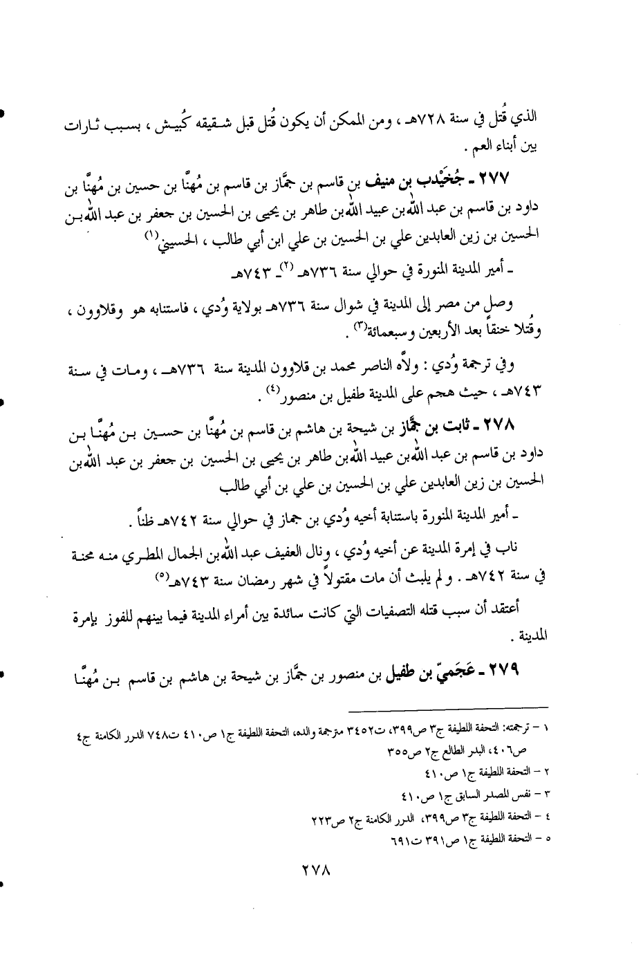 278 ... الذي قُتل في سنة 728هـ، ومن الممكن أن يكون قُتل قبل شقيقه كُبيش، بسبب ثارات بين أبناء العم. 277 - جُخَيْدب بن منيف بن قاسم بن جمَّاز بن قاسم بن مُهنَّا بن حسين بن مُهنَّا بن داود بن قاسم بن عبد الله بن عبيد الله بن طاهر بن يحيى بن الحسين بن جعفر بن عبد الله بن الحسين بن زين العابدين علي بن الحسين بن علي ابن أبي طالب، الحسيني (1).