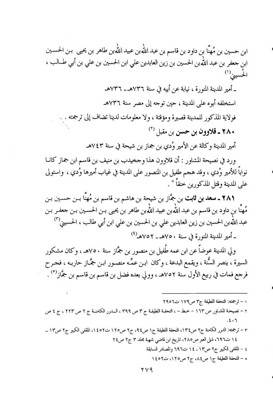 279 ... ابن حسين بن مهنا بن داود بن قاسم بن عبد الله بن عبيد الله بن طاهر بن يحيى بن الحسين ابن جعفر بن عبد الله بن الحسين بن زين العابدين علي ابن الحسين بن علي بن أبي طالب الحُسيني (1).