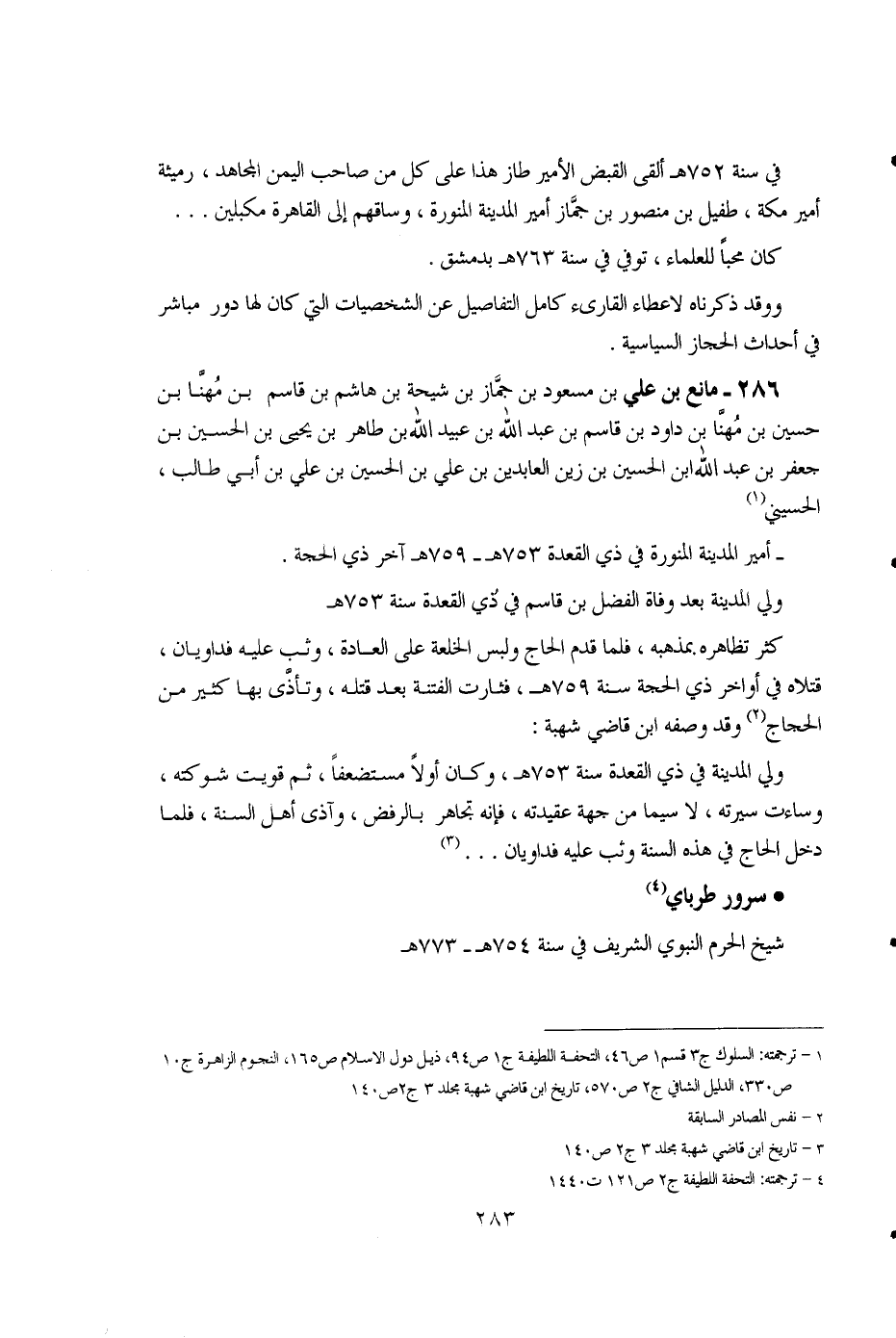283 ... في سنة 752 هـ ألقى القبض الأمير طاز هذا على كل من صاحب اليمن المجاهد، رميثة أمير مكة، طفيل بن منصور بن جمّاز أمير المدينة المنورة، وساقهم إلى القاهرة مكبلين ..