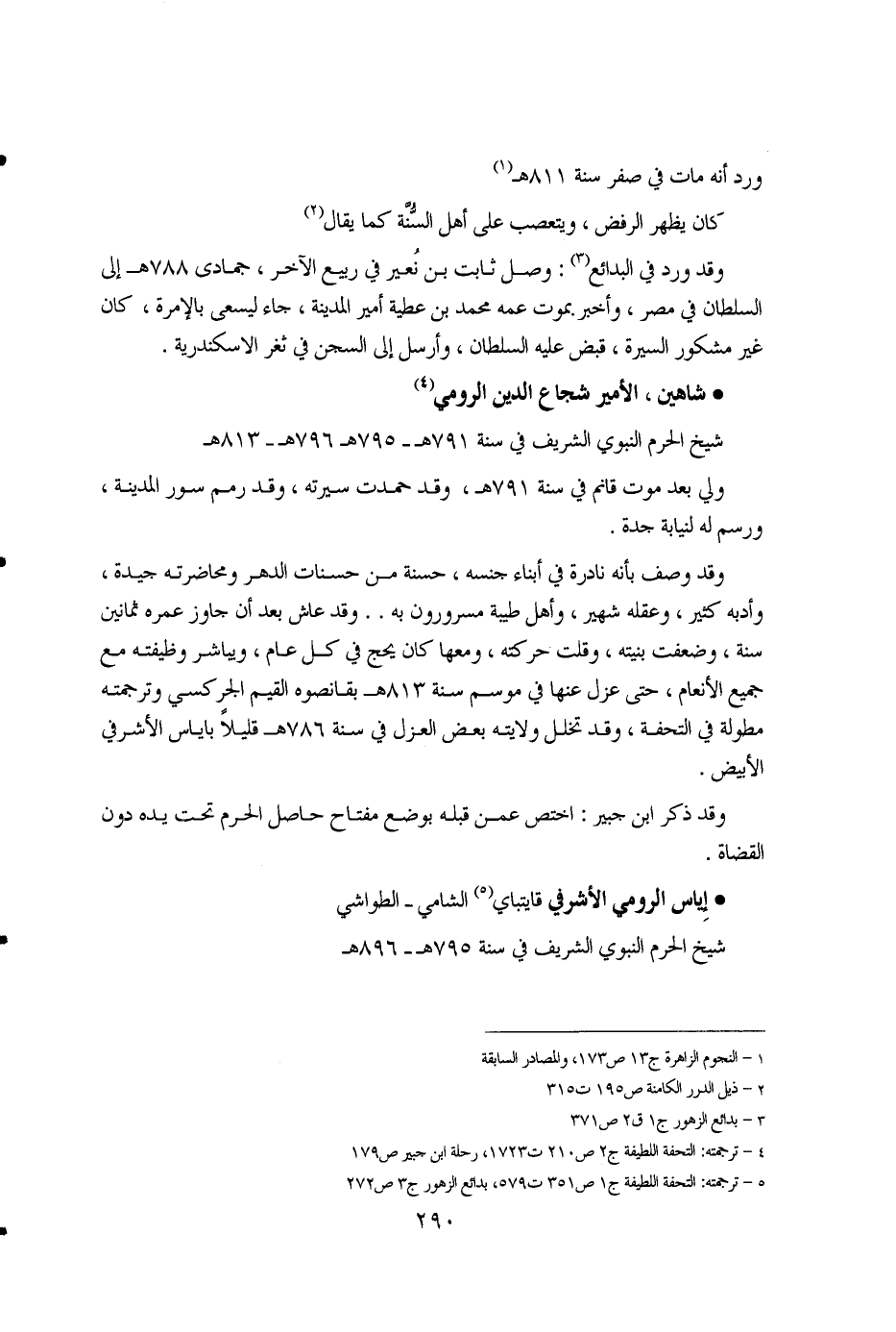 1 - النجوم الزاهرة ج13ص173، والمصادر السابقة 2 - ذيل الدرر الكامنة ص195 ت315 3 - بدائع الزهور ج1ق2ص371 4 - ترجمته: التحفة اللطيفة ج2ص210ت1723، رحلة ابن جبير ص179 5 - ترجمته: التحفة اللطيفة ج1ص351ت579، بدائع الزهور ج3ص272