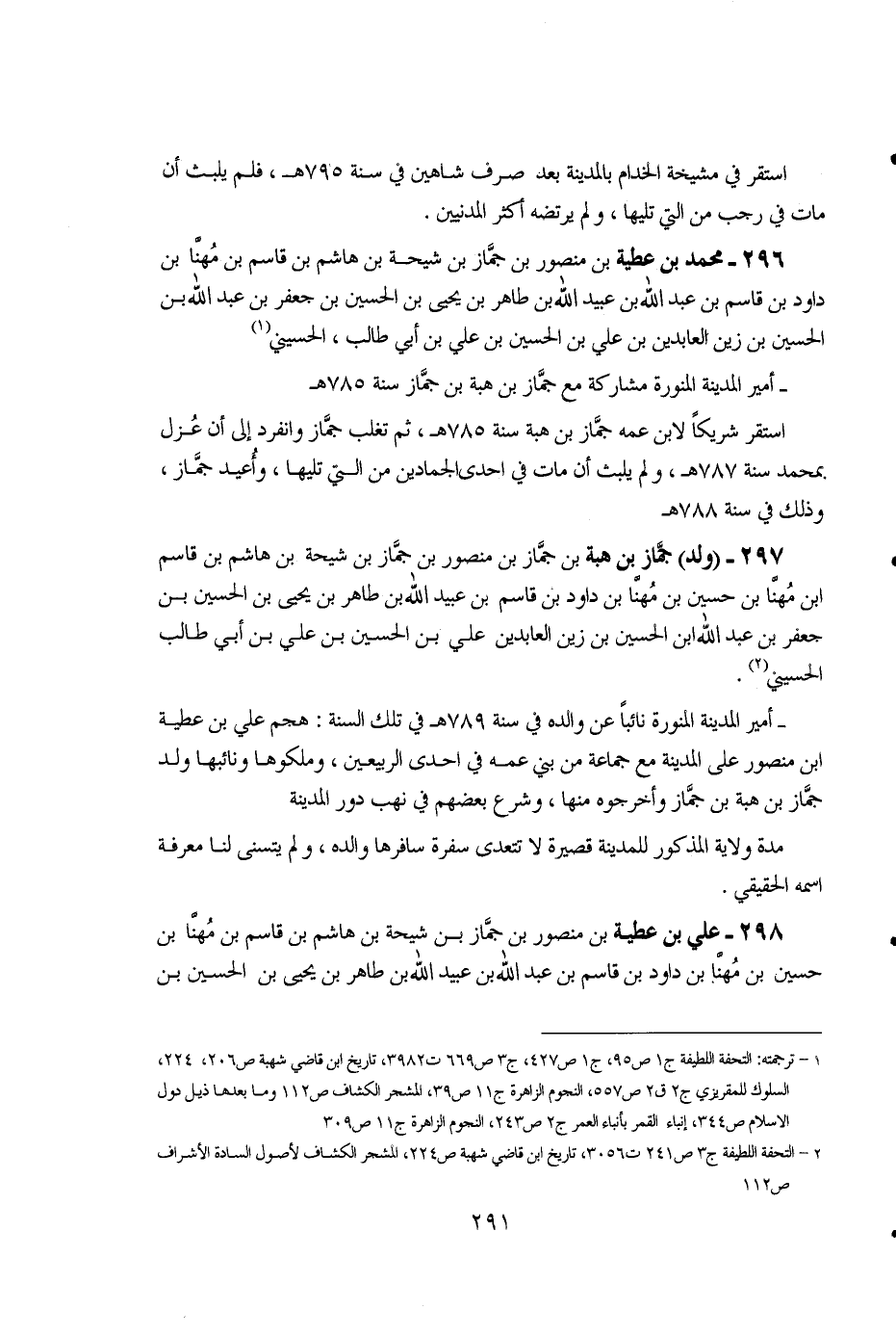 297 - (ولد) جماز بن هبة بن جمّاز بن منصور بن جمّاز بن شيحة بن هاشم بن قاسم ابن مهنا بن حسين بن مهنا بن داود بن قاسم بن عبيد الله بن طاهر بن يحيى بن الحسين بن جعفر بن عبد الله بن الحسين بن زين العابدين علي بن الحسين بن علي بن أبي طالب الحسيني (2). -أمير المدينة المنورة نائباً عن والده في سنة 789هـ في تلك السنة: هجم علي بن عطية ابن منصور على المدينة مع جماعة من بني عمه في إحدى الربيعين، وملكوها ونائبها ولد جمّاز بن هبة بن جمّاز وأخرجوه منها، وشرع بعضهم في نهب دور المدينة مدة ولاية المذكور للمدينة قصيرة لا تتعدى سفرة سافرها والده، ولم يتسنى لنا معرفة اسمه الحقيقي.