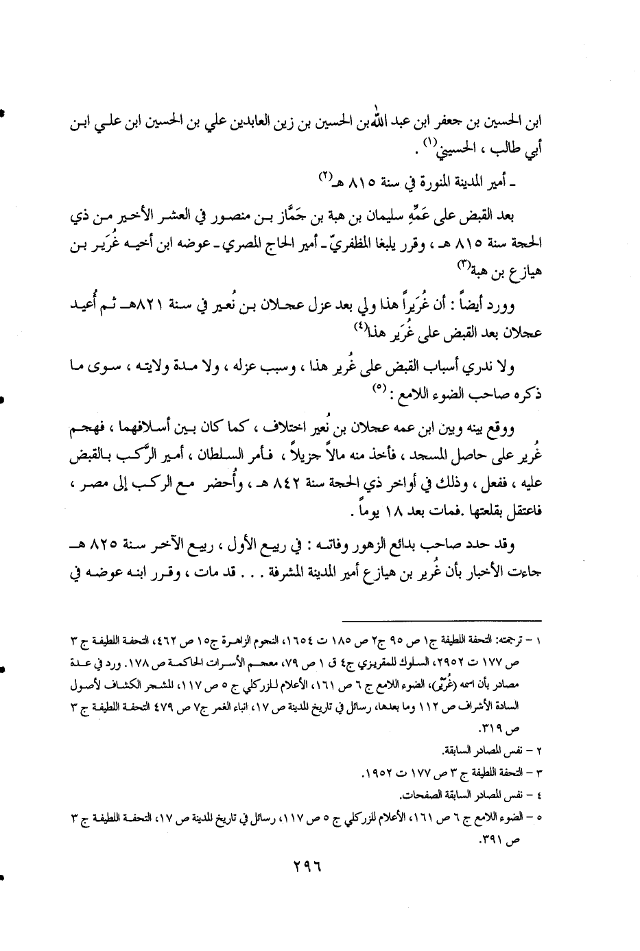 1 - ترجمته: التحفة اللطيفة ج 1 ص 95 ج 2 ص 185 ت 1654، النجوم الزاهرة ج 15 ص 462، التحفة اللطيفة ج 3 ص 177 ت 2952، السلوك للمقريزي ج 4 ق 1 ص 79، معجم الأسرات الحاكمة ص 178، ورد في عدة مصادر بأن اسمه (غرير)، الضوء اللامع ج 6 ص 161، الأعلام للزركلي ج 5 ص 117، المشجر الكشاف لأصول السادة الأشراف ص 112 وما بعدها، رسائل في تاريخ المدينة ص 17، أنباء الغمر ج 7 ص 479 التحفة اللطيفة ج 3 ص 319. 2 - نفس المصادر السابقة. 3 - التحفة اللطيفة ج 3 ص 177 ت 1952. 4 - نفس المصادر السابقة الصفحات. 5 - الضوء اللامع ج 6 ص 161، الأعلام للزركلي ج 5 ص 117، رسائل في تاريخ المدينة ص 17، التحفة اللطيفة ج 3، ص 391.
