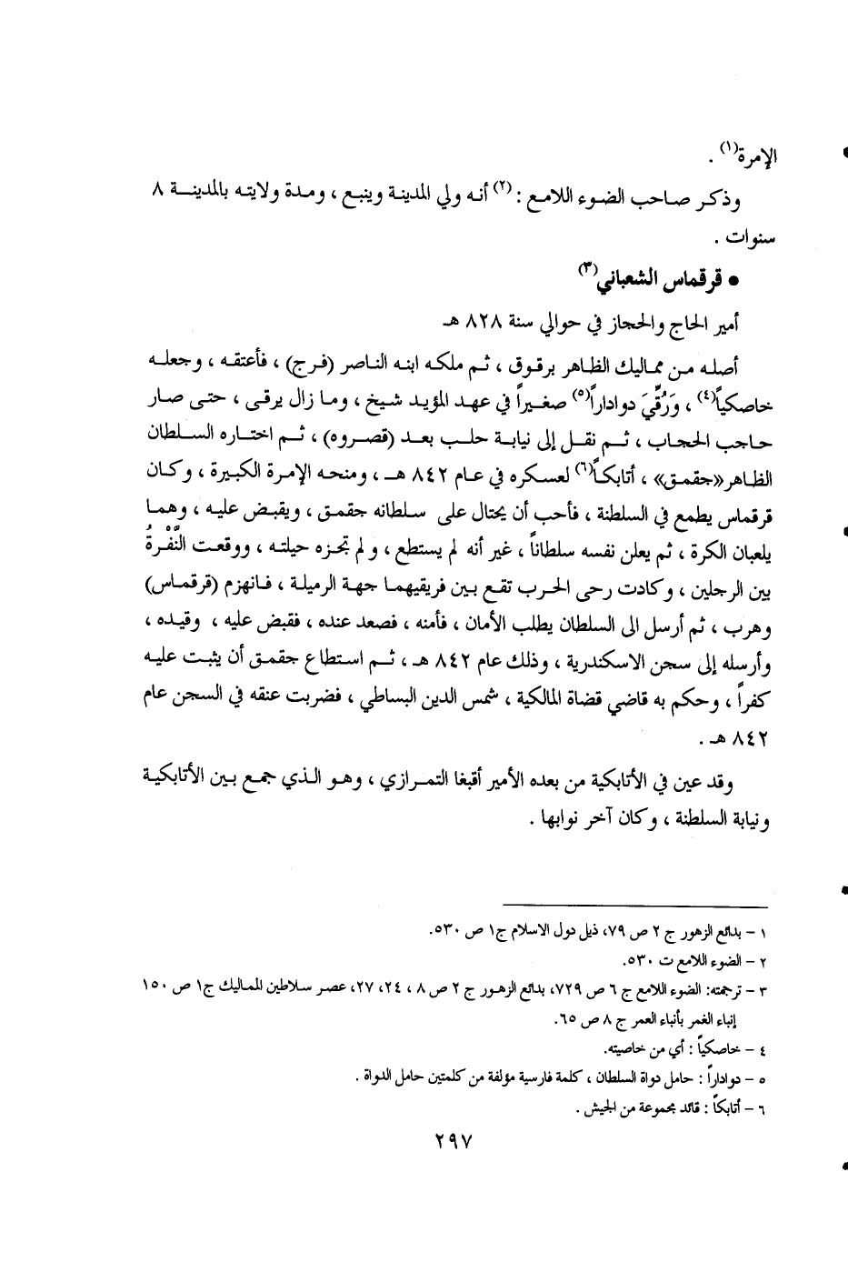 1 - بدائع الزهور ج 2 ص 79، ذيل دور الإسلام ج 1 ص 530. 2 - الضوء اللامع ت 530. 3 - ترجمته: الضوء اللامع ج 6 ص 729، بدائع الزهور ج 2 ص 8، 24،27، عصر سلاطين المماليك ج 1 ص 150 إنباء الغمر بأنباء العمر ج 8 ص 65. 4 - خاصكياً: أي من خاصيته 5 - دواداراً: حامل دواة السلطان، كلمة فارسية مؤلفة من كلمتين حامل الدواة 6 - أتابكاً: قائد مجموعة من الجيش.