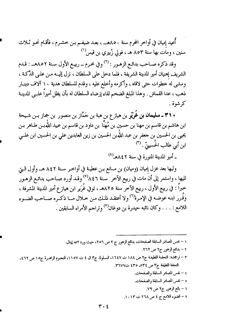 304 ... أعيد إميان في أواخر المحرم سنة 850 هـ، بعد ضيغم بن خشرم، فأقام نحو ثلاث سنين، ومات بها سنة 853 هـ، فولي زبيري بن قيس (1) وقد ذكره صاحب بدائع الزهور: (2) وفي محرم - ربيع الأول سنة 852 هـ: قدم الشريف إهنيان أمير المدينة الشريفة، فلما دخل على السلطان، نزل إليه من على الدكة، ومشى له خطوات حتى لاقاه، وأكرمه وأخلع عليه، وقدم للسلطان هدية 10 آلاف دينار ذهب، عدا القماش. وهذا المبلغ الضخم لقاء إرضاء السلطان له بأن يظل أميراً على المدينة كرشوة.