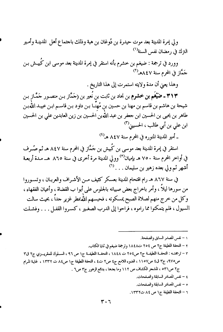 306 ... ولي إمرة المدينة بعد موت حيدرة بن دوغان بن هبة وذلك باجتماع أهل المدينة وأمير الترك في رمضان نفس السنة (1) وورد في ترجمة: ضيغم بن خشرم بأنه استقر في إمرة المدينة بعد موسى ابن كبيش بن جماز في المحرم سنة 847 هـ (2). وهذا يعني أن مدة ولايته استمرت إلى هذا التاريخ.
