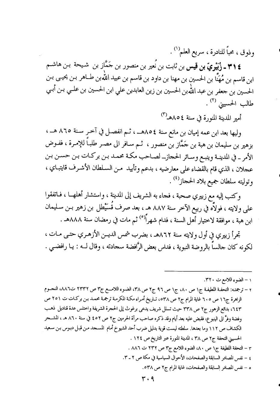 1 - الضوء اللامع ت 320. 2 - ترجمته: التحفة اللطيفة ج 1 ص 80، ج 1 ص 96 ص 38، الضوء اللامع ج 3 ص 2332 ت 886، النجوم الزاهرة ج 16 ص 605 غاية المرام ج 2 ص 538، تاريخ أمراء مكة المكرمة ترجمة محمد بن بركات ت 251 ص 643، بدائع الزهور ج 2 ص 338 حيث تسلل شريف يدعى برغوث إلى الحجرة الشريفة واختلس عدة قناديل ذهب وفضة وفر إلى الينبوع، فقبض عليه بعد أيام وقد ذكره صاحب مرآة الحرمين ج 2 ص 452 في سنة 860 هـ، المشجر الكشاف ص 112 وما بعدها. سلطته ليست قوية بدليل ضرب أحد الشيوخ أمام المسجد من قبل دبوس بن سعيد الحسيني التحفة ج 2 ص 38، المدينة المنورة عبر التاريخ ص 124. 3 - التحفة اللطيفة ج 1 ص 80، الضوء اللامع ج 3 ص 232 ت 886. 4 - نفس المصادر السابقة والصفحات، والأحوال السياسية في مكة ص 2 - 3. 5 - نفس المصادر السابقة والصفحات، غاية المرام ج 2 ص 538.