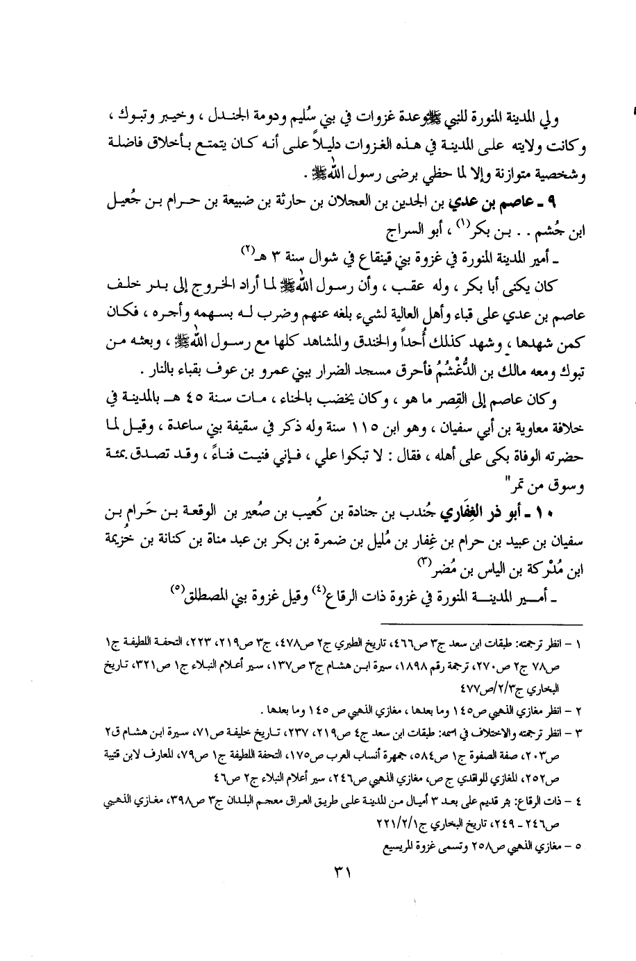 2 - انظر مغازي الذهبي ص145 وما بعدها، مغازي الذهبي ص145 ما بعدها3 - انظر ترجمته والاختلاف في اسمه: طبقات ابن سعد ج4 ص219، 237، تاريخ خليفة ص71، سيرة ابن هشام ق2 ص203، صفة الصفوة ج1 ص584، جمهرة أنساب العرب ص175، التحفة اللطيفة ج1 ص79، المعارف لابن قتيبة ص252، المعازي للواقدي ج ص، معازي الذهبي ص246، سير أعلام النبلاء ج2 ص46.