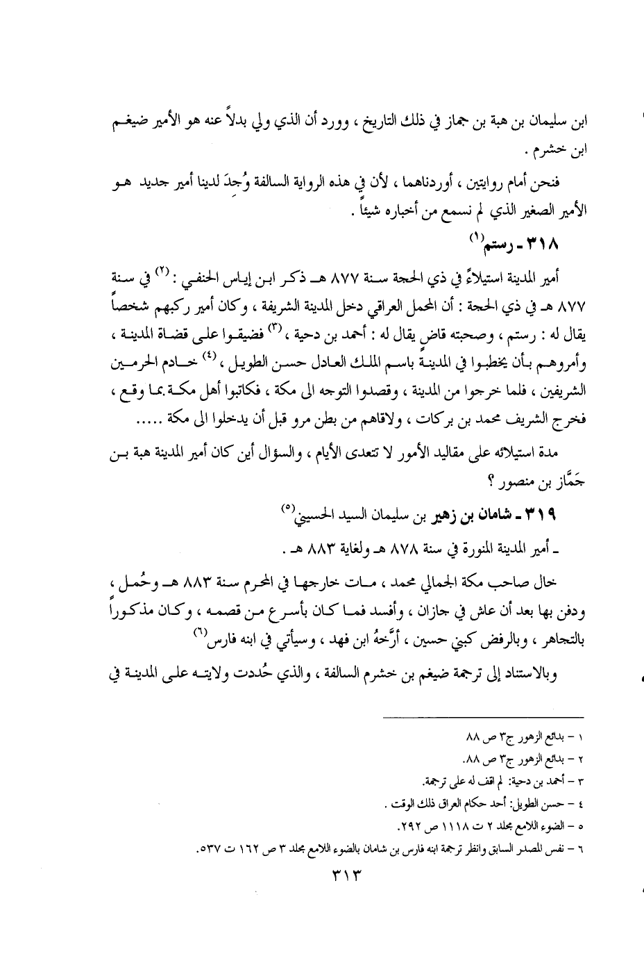313 ... ابن سليمان بن هبة بن جماز في ذلك التاريخ، وورد أن الذي ولى بدلاً عنه هو الأمير ضيغم ابن خشرم. فنحن أمام روايتين، أوردناهما، لأن في هذه الرواية السالفة وجد لدينا أمير جديد هو الأمير الصغير الذي لم نسمع من أخباره شيئاً.