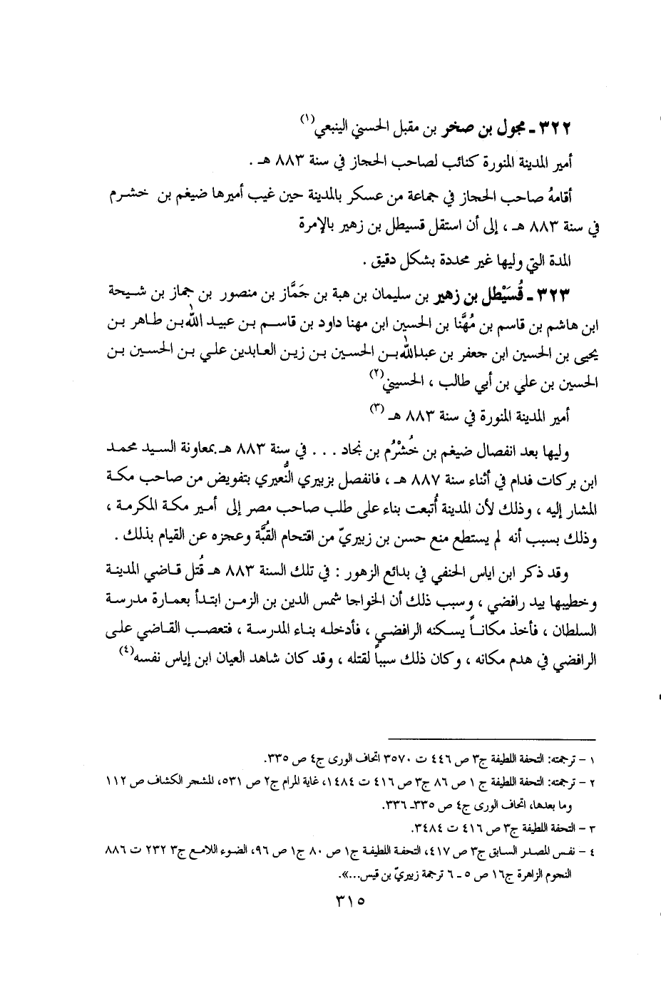 1 - ترجمته: التحفة اللطيفة ج 3 ص 446 ت 3570 اتحاف الورى ج 4 ص 335. 2 - ترجمته: التحفة اللطيفة ج 1 ص 86 ج 3 ص 416 ت 1484، غاية المرام ج 2 ص 531، المشجر الكشاف ص 112 وما بعدها، اتحاف الورى ج 4 ص 335 - 336. 3 - التحفة اللطيفة ج 3 ص 416 ت 3484 4 - نفس المصدر السابق ج 3 ص 417، التحفة اللطيفة ج 1 ص 80 ج 1 ص 96، الضوء اللامع ج 3 232 ت 886 النجوم الزاهرة ج 16 ص 5 - 6 ترجمة زبيري بن قيس…"