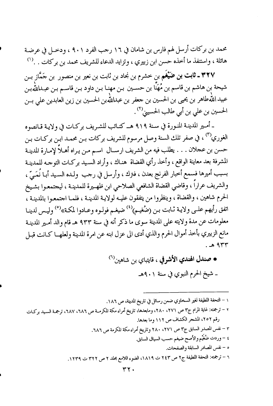 1 - التحفة اللطيفة لغير السخاوي ضمن رسائل في تاريخ المدينة، ص 186. 2 - ترجمته: غاية المرام ج 3 ص 271، 280، وما بعدها، تاريخ أمراء مكة المكرمة ص 686،687، ترجمة السيد بركات رقم 252، المشجر الكشاف ص 112 وما بعدها. 3 - نفس المصدر السابق ج 3 ص 271، 280 وتاريخ أمراء مكة المكرمة ص 686. 4 - وردت ضغيم والأصح ضيغم حسب السياق السابق 5 - نفس المصادر السابقة والصفحات 6 - ترجمته: التحفة اللطيفة ج 2 ص 243 ت 1819، الضوء اللامع مجلد 2 ص 322 ت 1239.