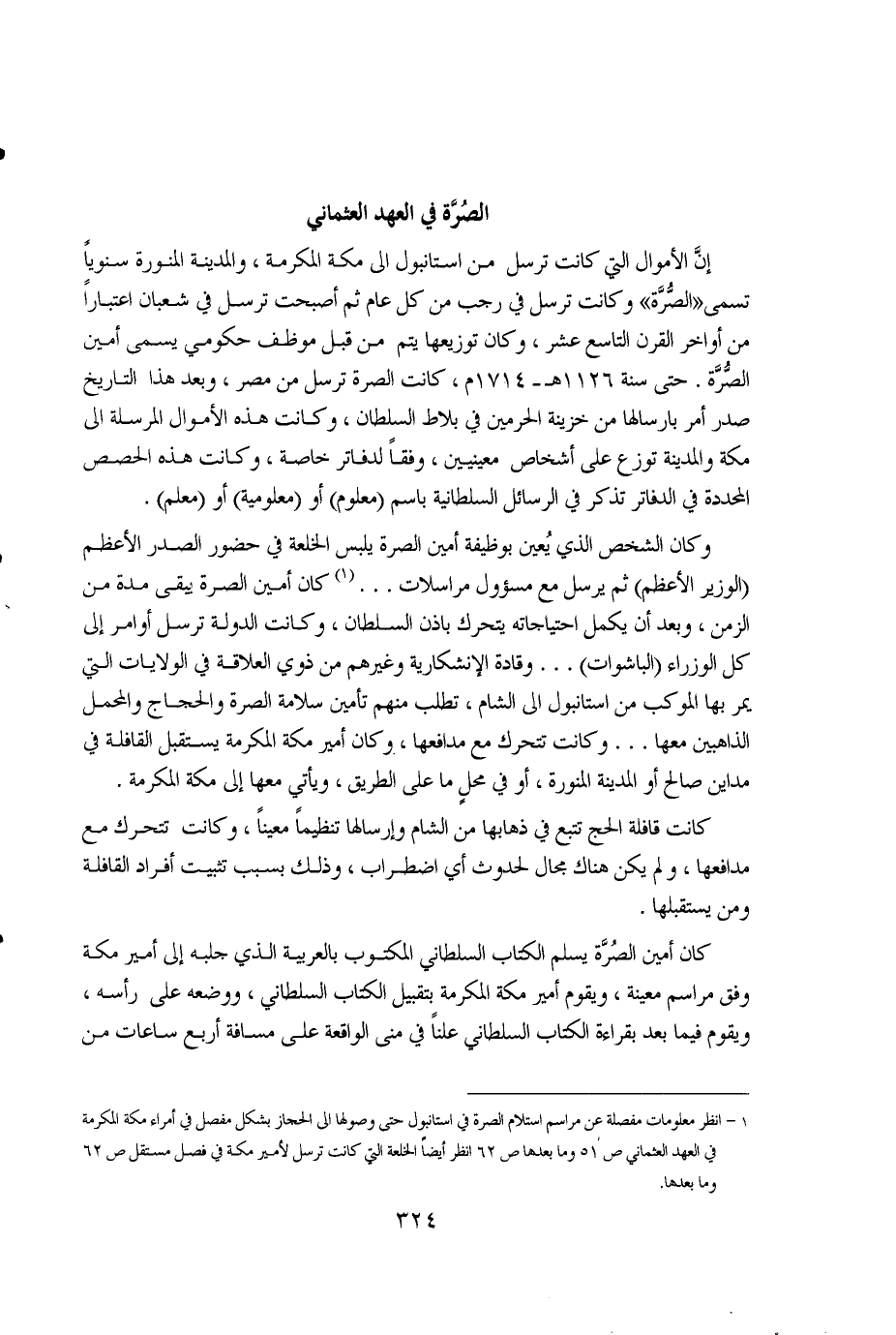 1 - انظر معلومات مفصلة عن مراسم استلام الصرة في استانبول حتى وصولها إلى الحجاز بشكل مفصل في أمراء مكة المكرمة في العهد العثماني ص 51 وما بعدها ص 62 انظر أيضاً الخلعة التي كانت ترسل لأمير مكة في فصل مستقل ص 62 وما بعدها.