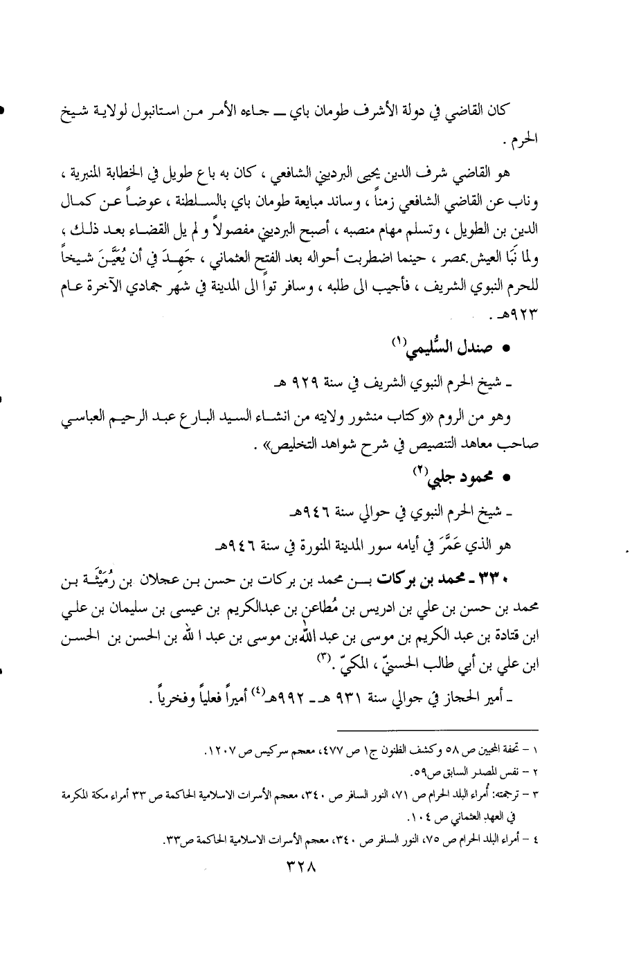 1 - تحفة المحبين ص58 وكشف الظنون ج1 ص477، معجم سركيس ص1207. 2 - نفس المصدر السابق ص59. 3 - ترجمته: أمراء البلد الحرام ص71، النور السافر ص340، معجم الأسرات الإسلامية الحاكمة ص33 أمراء مكة المكرمة في العهد العثماني ص104. 4 - أمراء البلد الحرام ص75، النور السافر ص340، معجم الأسرات الإسلامية الحاكمة ص33.