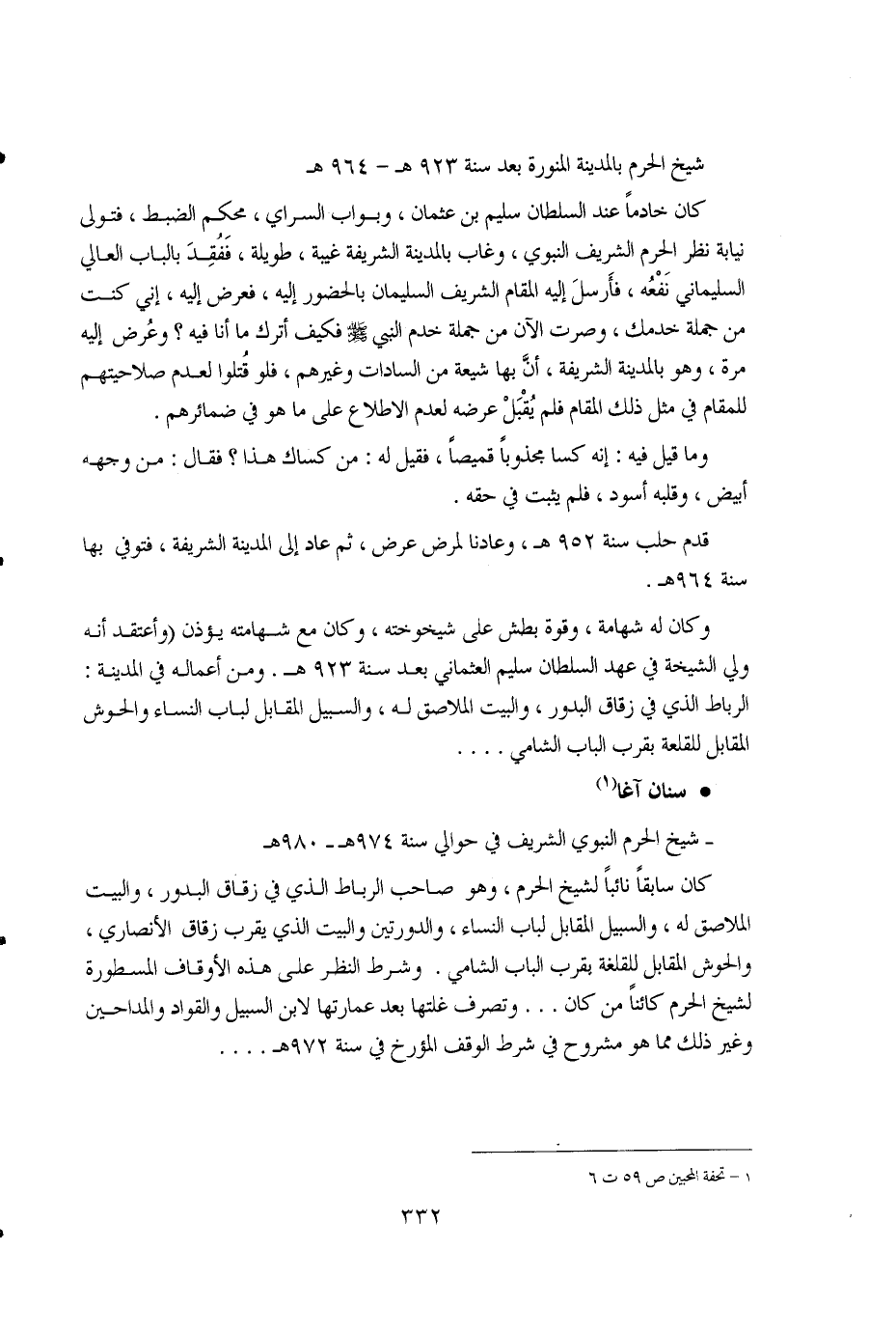 332 ... شيخ الحرم بالمدينة المنورة بعد سنة 923هـ - 964هـ. كان خادماً عند السلطان سليم بن عثمان، وبواب السراي، محكم الضبط، فتولى نيابة نظر الحرم الشريف النبوي، وغاب بالمدينة الشريفة غيبة، طويلة، ففقد بالباب العالي السليماني نفعه، فأرسل إليه المقام الشريف السليمان بالحضور إليه، فعرض إليه، إني كنت من جملة خدمك، وصرت الآن من جملة خدم النبي صلى الله عليه وسلم فكيف أترك ما أنا فيه؟ وعرض إليه مرة، وهو بالمدينة الشريفة، أن بها شيعة من السادات وغيرهم، فلو قتلوا لعدم صلاحيتهم للمقام في مثل ذلك المقام فلم يقبل عرضه لعدم الاطلاع على ما هو في ضمائرهم. وما قيل فيه: إنه كسا مجذوباً قميصاً، فقيل له: من كساك هذا؟ فقال: من وجهه أبيض، وقلبه أسود، فلم يثبت في حقه. قدم حلب سنة 952هـ، وعادنا لمرض عرض، ثم عاد إلى المدينة الشريفة، فتوفي بها سنة 964هـ. وكان له شهامة، وقوة بطش على شيخوخته، وكان مع شهامته يؤذن (وأعتقد أنه ولي الشيخة في عهد السلطان سليم العثماني بعد سنة 923هـ. ومن أعماله في المدينة: الرباط الذي في زقاق البدور، والبيت الملاصق له، والسبيل المقابل لباب النساء والحوش المقابل للقلعة بقرب الباب الشامي ..