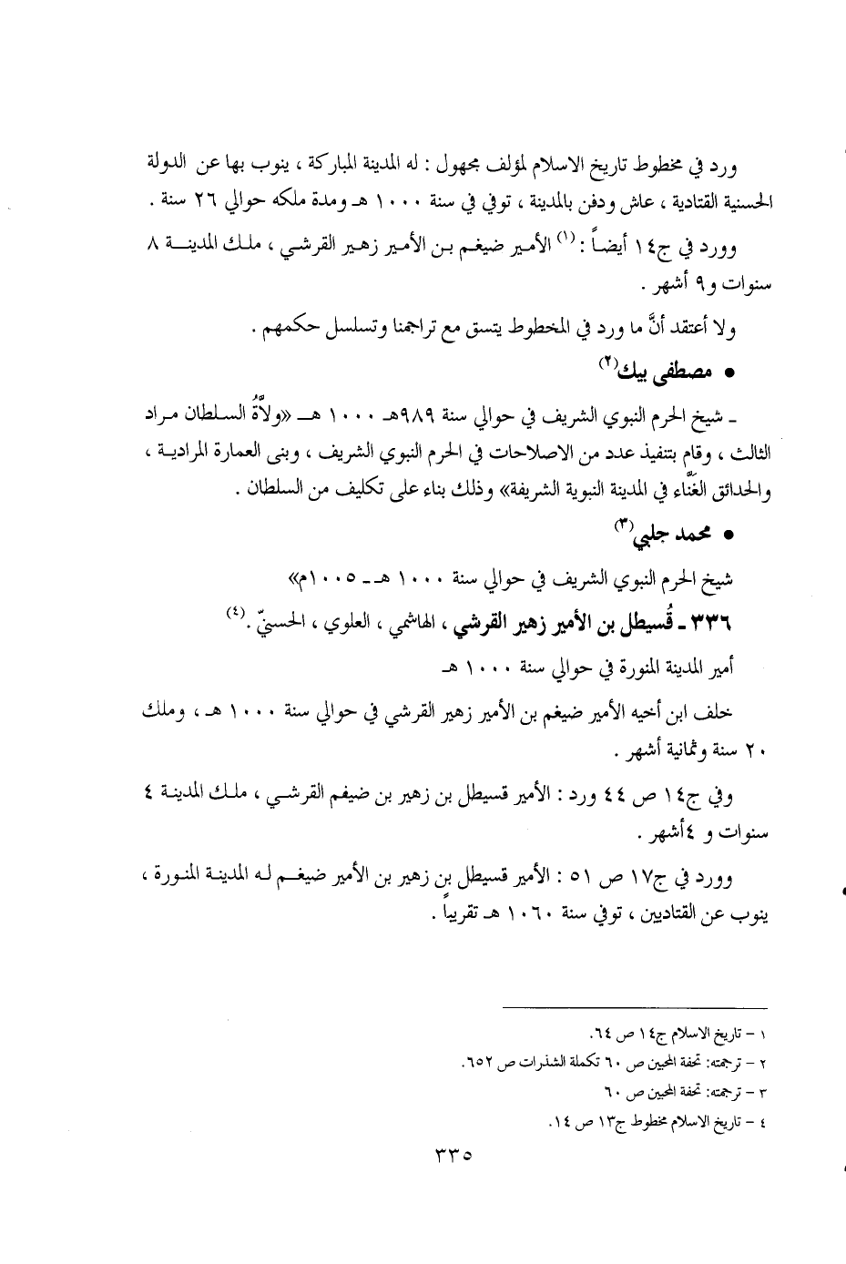 335 ... ورد في مخطوط تاريخ الإسلام لمؤلف مجهول: له المدينة المباركة، ينوب بها عن الدولة الحسنية القتادية، عاش ودفن بالمدينة، توفي في سنة 1000هـ ومدة ملكه حوالي 26 سنة. وورد في ج14 أيضاً: (1) الأمير ضيغم بن الأمير زهير القرشي، ملك المدينة 8 سنوات و9 أشهر. ولا أعتقد أن ما ورد في المخطوط يتسق مع تراجمنا وتسلسل حكمهم.