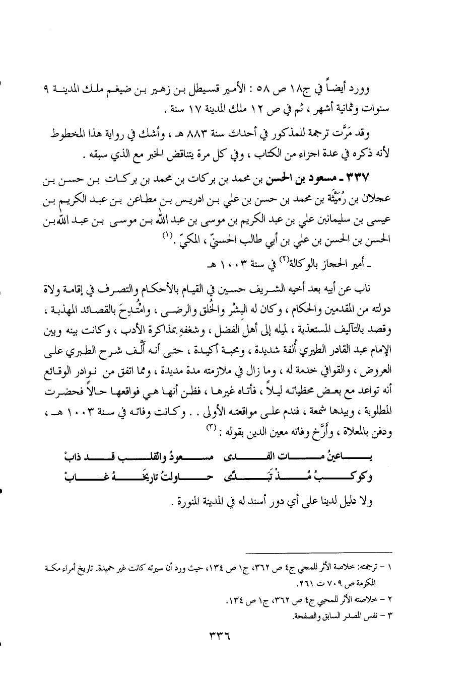 337 - مسعود بن الحسن بن محمد بن بركات بن محمد بن بركات بن حسن بن عجلان بن رميثة بن محمد بن حسن بن علي بن إدريس بن مطاعن بن عبد الكريم بن عيسى بن سليمان بن علي بن عبد الكريم بن موسى بن عبد الله بن موسى بن عبد الله بن الحسن بن الحسن بن علي بن أبي طالب الحسني، المكي. (1) -أمير الحجاز بالوكالة (2) في سنة 1003هـ ناب عن أبيه بعد أخيه الشريف حسين في القيام بالأحكام والتصرف في إقامة ولاة دولته من المقدمين والحكام، وكان له البشر والخلق والرضى، وامتدح بالقصائد المهذبة، وقصد بالتآليف المستعذبة، لميله إلى أهل الفضل، وشغفه بمذاكرة الأدب، وكانت بينه وبين الإمام عبد القادر الطيري ألفة شديدة، ومحبة أكيدة، حتى أنه ألف شرح الطبري على العروض، والقوافي خدمة له، وما زال في ملازمته مدة مديدة، ومما اتفق من نوادر الوقائع أنه تواعد مع بعض محظياته ليلاً، فأتاه غيرها، فظن أنها هي فواقعها حالاً فحضرت المطلوبة، وبيدها شمعة، فندم على مواقعته الأولى .. وكانت وفاته في سنة 1003هـ، ودفن بالمعلاة، وأرخ وفاته معين الدين بقوله: (3)
