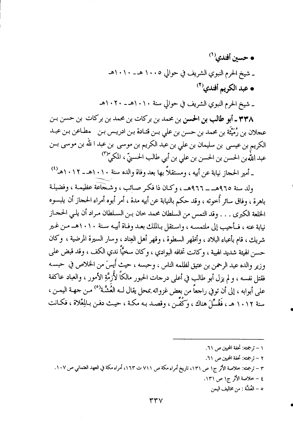 338 - أبو طالب بن الحسن بن محمد بن بركات بن محمد بن بركات بن حسن بن عجلان بن رميثة بن محمد بن حسن بن علي بن قتادة بن إدريس بن مطاعن بن عبد الكريم بن عيسى بن سليمان بن علي بن عبد الكريم بن موسى بن عبد الله بن موسى بن عبد الله بن الحسن بن الحسن بن علي بن أبي طالب الحسني، المكي (3)