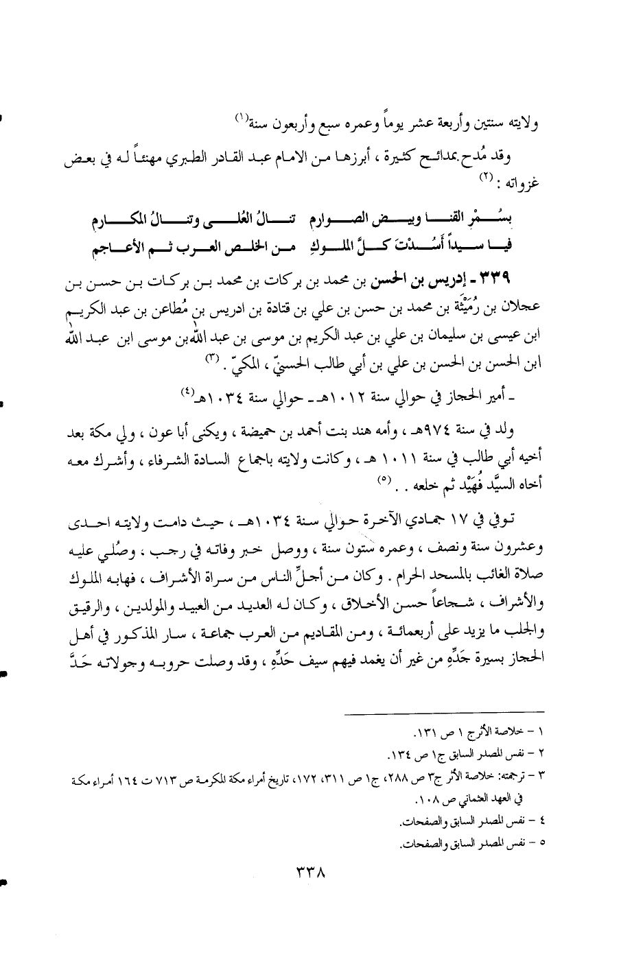 339 - إدريس بن الحسن بن محمد بن بركات بن محمد بن بركات بن حسن بن عجلان بن رميثة بن محمد بن حسن بن علي بن قتادة بن إدريس بن مطاعن بن عبد الكريم ابن عيسى بن سليمان بن علي بن عبد الكريم بن موسى بن عبد الله بن موسى ابن عبد الله ابن الحسن بن الحسن بن علي بن أبي طالب الحسني، المكي. (3)