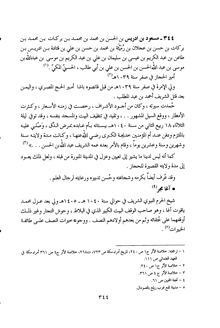 344 - مسعود بن إدريس بن الحسن بن محمد بن محمد بن بركات بن محمد بن بركات بن حسن بن عجلان بن رميثة بن محمد بن حسن بن علي بن قتادة بن إدريس بن طاعن بن عبد الكريم بن عيسى بن سليمان بن علي بن عبد الكريم بن موسى بن عبد الله بن موسى بن عبد الله الحسن بن الحسن بن علي بن أبي طالب، الحسني المكي. (1) أمير الحجاز في صفر سنة 1039 (2) ولي الإمرة في صفر سنة 1039هـ من قبل قانصوه باشا أمير الحج المصري، واليمن بعد قتل الشريف أحمد بن عبد المطلب. حمدت سيرته، وكان من أجود الأشراف، رخصت في زمنه الأسعار، وكثرت الأمطار، ووقع السيل المشهور…، وتقيد في تنظيف البيت والمسجد بنفسه، وقد توفي ليلة الثلاثاء 18 ربيع الثاني من سنة 1040هـ ببستانه بأم عابده بمرض الدق، وصلي عليه بالملتزم ودفن عند أم المؤمنين خديجة الكبرى رضي الله عنها، وكانت مدة ولايته سنة وشهرين وسنة وعشرين يوماً، وقام بالأمر بعده عمه الشريف عبد الله بن الحسن…" (3) كما أنه ليس لدينا ما يشير إلى تعيين وعزل في المدينة المنورة من قبله، ولعل ذلك يعود إلى مدة ولايته القصيرة للحجاز. وقد عرف أيضاً بكرمه وشجاعته وحسن تدبيره ورعايته لرجال العلم.