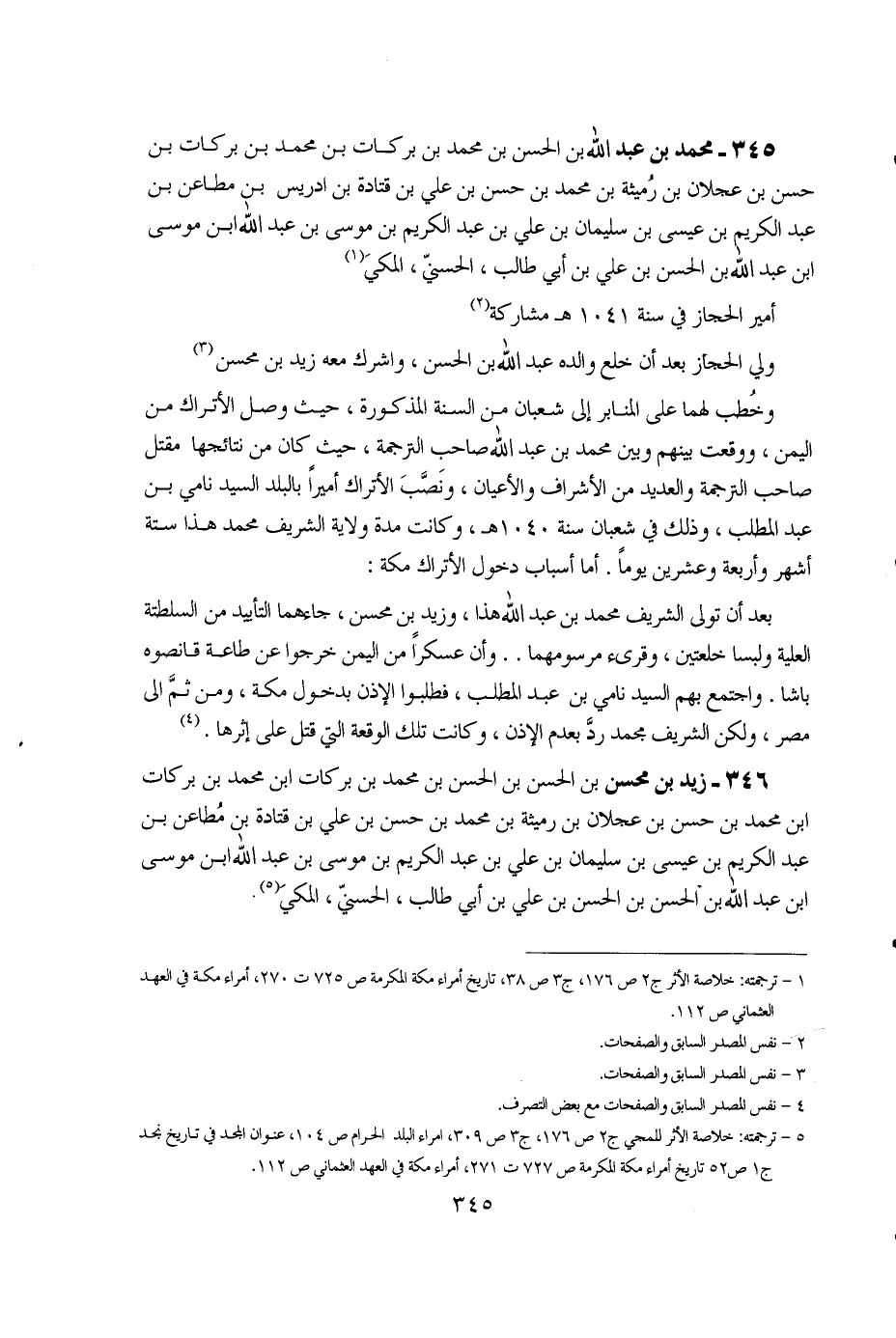 345 - محمد بن عبد الله بن الحسن بن محمد بن بركات بن محمد بن بركات بن حسن بن عجلان بن رميثة بن محمد بن حسن بن علي بن قتادة بن إدريس بن مطاعن بن عبد الكريم بن عيسى بن سليمان بن علي بن عبد الكريم بن موسى بن عبد الله ابن موسى ابن عبد الله بن الحسن بن علي بن أبي طالب، الحسني، المكي (1) أمير الحجاز في سنة 1041هـ مشاركة (2) ولي الحجاز بعد أن خلع والده عبد الله بن الحسن، وأشرك معه زيد بن محسن (3) وخطب لهما على المنابر إلى شعبان من السنة المذكورة، حيث وصل الأتراك من اليمن، ووقعت بينهم وبين محمد بن عبد الله صاحب الترجمة، حيث كان من نتائجها مقتل صاحب الترجمة والعديد من الأشراف والأعيان، ونصب الأتراك أميراً بالبلد السيد نامي بن عبد المطلب، وذلك في شعبان سنة 1040هـ، وكانت مدة ولاية الشريف محمد هذا ستة أشهر وأربعة وعشرين يوماً. أما أسباب دخول الأتراك مكة: بعد أن تولى الشريف محمد بن عبد الله هذا، وزيد بن محسن، جاءهما التأييد من السلطة العلية ولبسا خلعتين، وقرئ مرسومهما… وأن عسكراً من اليمن خرجوا عن طاعة قانصوه باشا. واجتمع بهم السيد نامي بن عبد المطلب، فطلبوا الإذن بدخول مكة، ومن ثم إلى مصر، ولكن الشريف محمد رد بعدم الإذن، وكانت تلك الوقعة التي قتل على إثرها. (4)