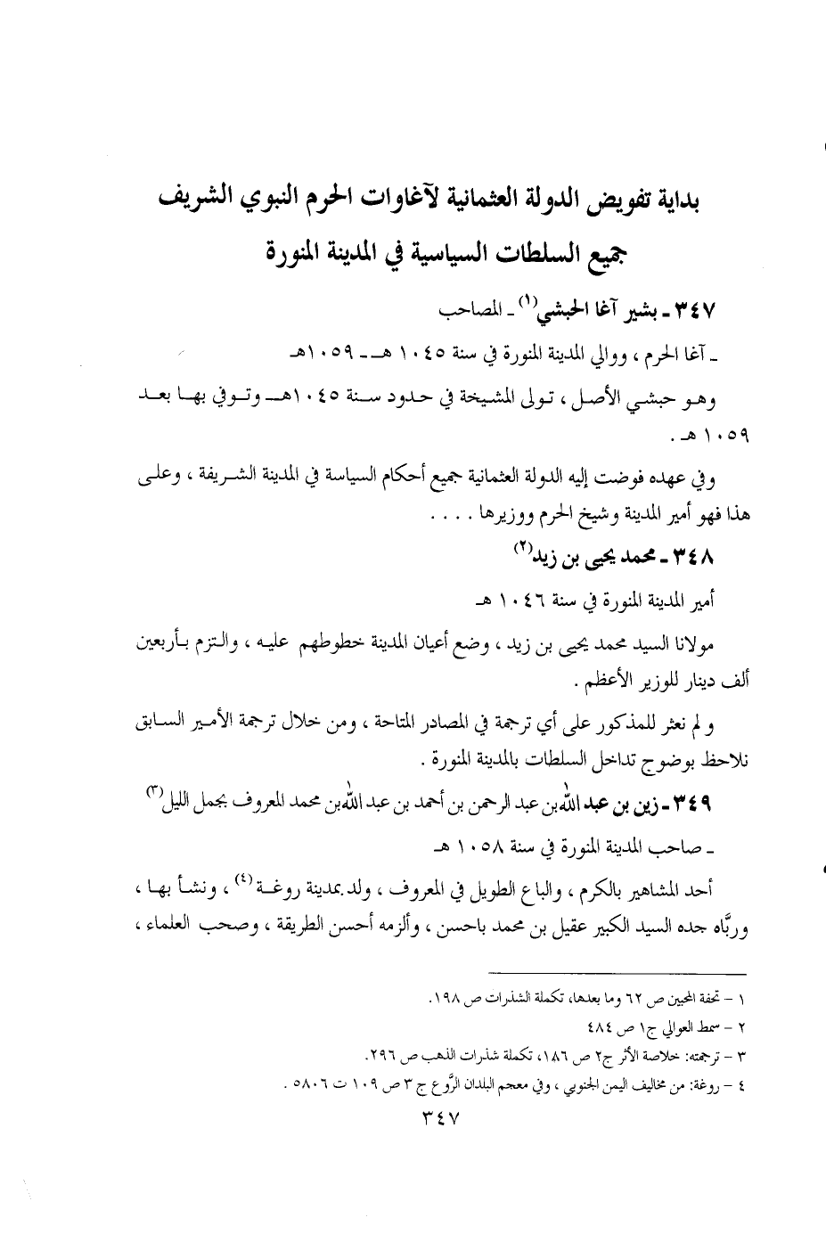 - آغا الحرم، ووالي المدينة المنورة في سنة 1045هـ- 1059هـ وهو حبشي الأصل، تولى المشيخة في حدود سنة 1045هـ وتوفي بها بعد 1059هـ. وفي عهده فوضت إليه الدولة العثمانية جميع أحكام السياسة في المدينة الشريفة، وعلى هذا فهو أمير المدينة وشيخ الحرم ووزيرها…