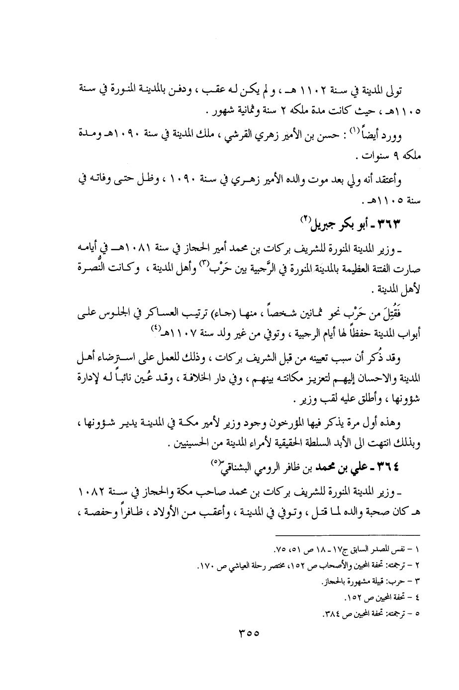 355 ... تولى المدينة في سنة 1102هـ، ولم يكن له عقب، ودفن بالمدينة المنورة في سنة1105هـ، حيث كانت مدة ملكه 2 سنة وثمانية شهور. وورد أيضاً: (1): حسن بن الأمير زهري القرشي، ملك المدينة في سنة 1090هـ ومدة ملكه 9 سنوات. وأعتقد أنه ولي بعد موت والده الأمير زهري في سنة 1090، وظل حتى وفاته في سنة1105هـ.