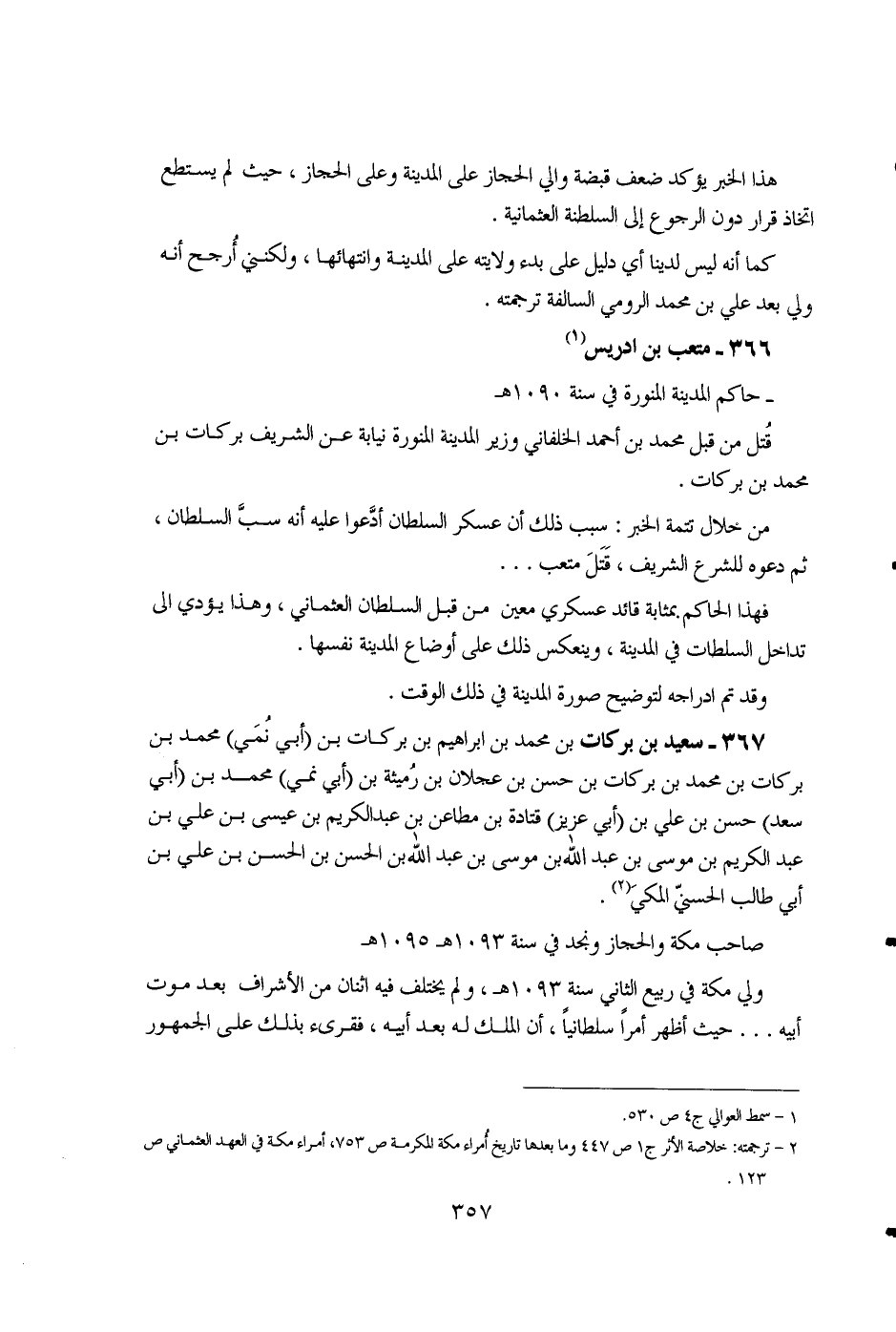 367 - سعيد بن بركات بن محمد بن إبراهيم بن بركات بن (أبي نمي) محمد بن بركات بن محمد بن بركات بن حسن بن عجلان بن رميثة بن (أبي نمي) محمد بن (أبي سعد) حسن بن علي بن (أبي عزيز) قتادة بن مطاعن بن عبد الكريم بن عيسى بن علي بن عبد الكريم بن موسى بن عبد الله بن موسى بن عبد الله بن الحسن بن الحسن بن علي بن أبي طالب الحسني المكي (2). صاحب مكة والحجاز ونجد في سنة 1093هـ 1095هـ ولي مكة في ربيع الثاني سنة 1093هـ، ولم يختلف فيه اثنان من الأشراف بعد موت أبيه… حيث أظهر أمراً سلطانياً، أن الملك له بعد أبيه، فقرئ بذلك على الجمهور ...