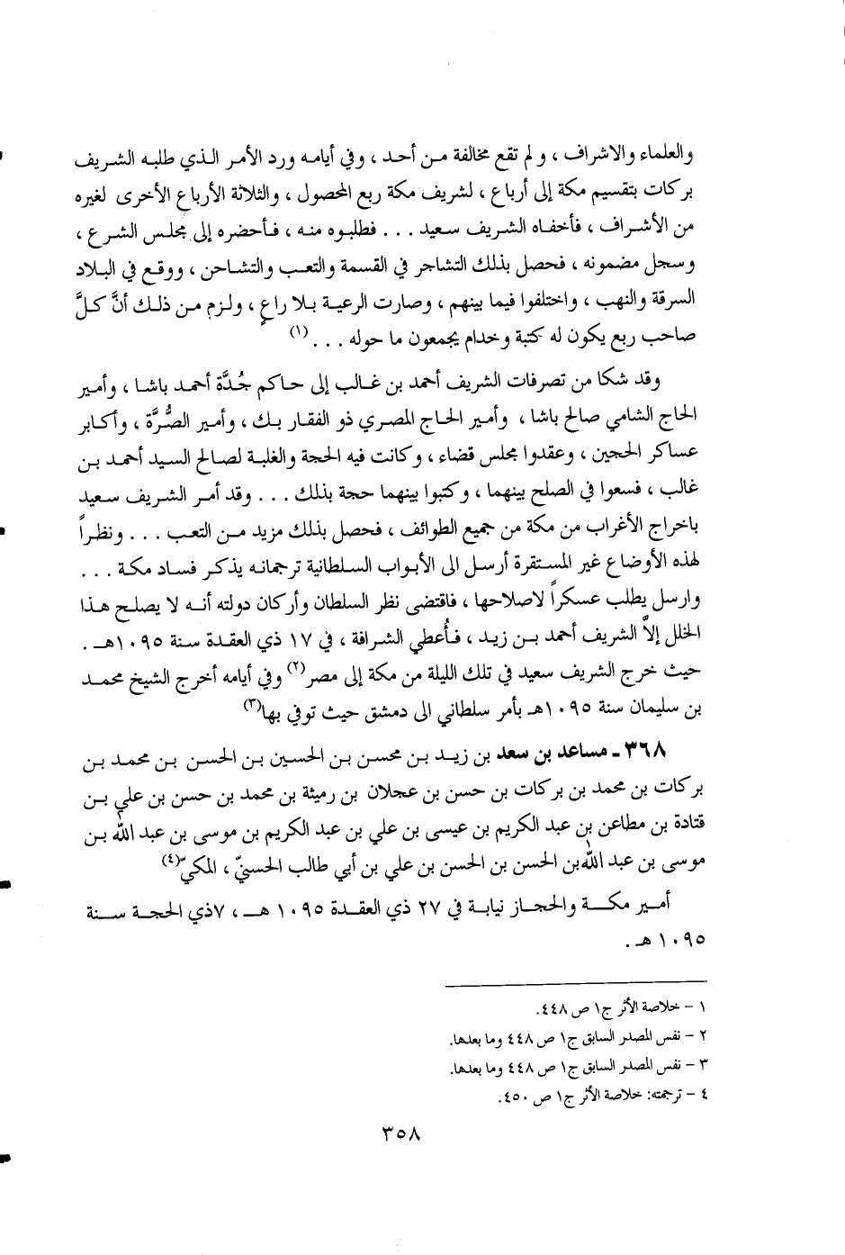 368 - مساعد بن سعد بن زيد بن محسن بن الحسين بن الحسن بن محمد بن بركات بن محمد بن بركات بن حسن بن عجلان بن رميثة بن محمد بن حسن بن علي بن قتادة بن مطاعن بن عبد الكريم بن عيسى بن علي بن عبد الكريم بن موسى بن عبد الله بن موسى بن عبد الله بن الحسن بن الحسن بن علي بن أبي طالب الحسني، المكي (4) أمير مكة والحجاز نيابة في 27 ذي القعدة 1095هـ، 7 ذي الحجة سنة 1095هـ ....