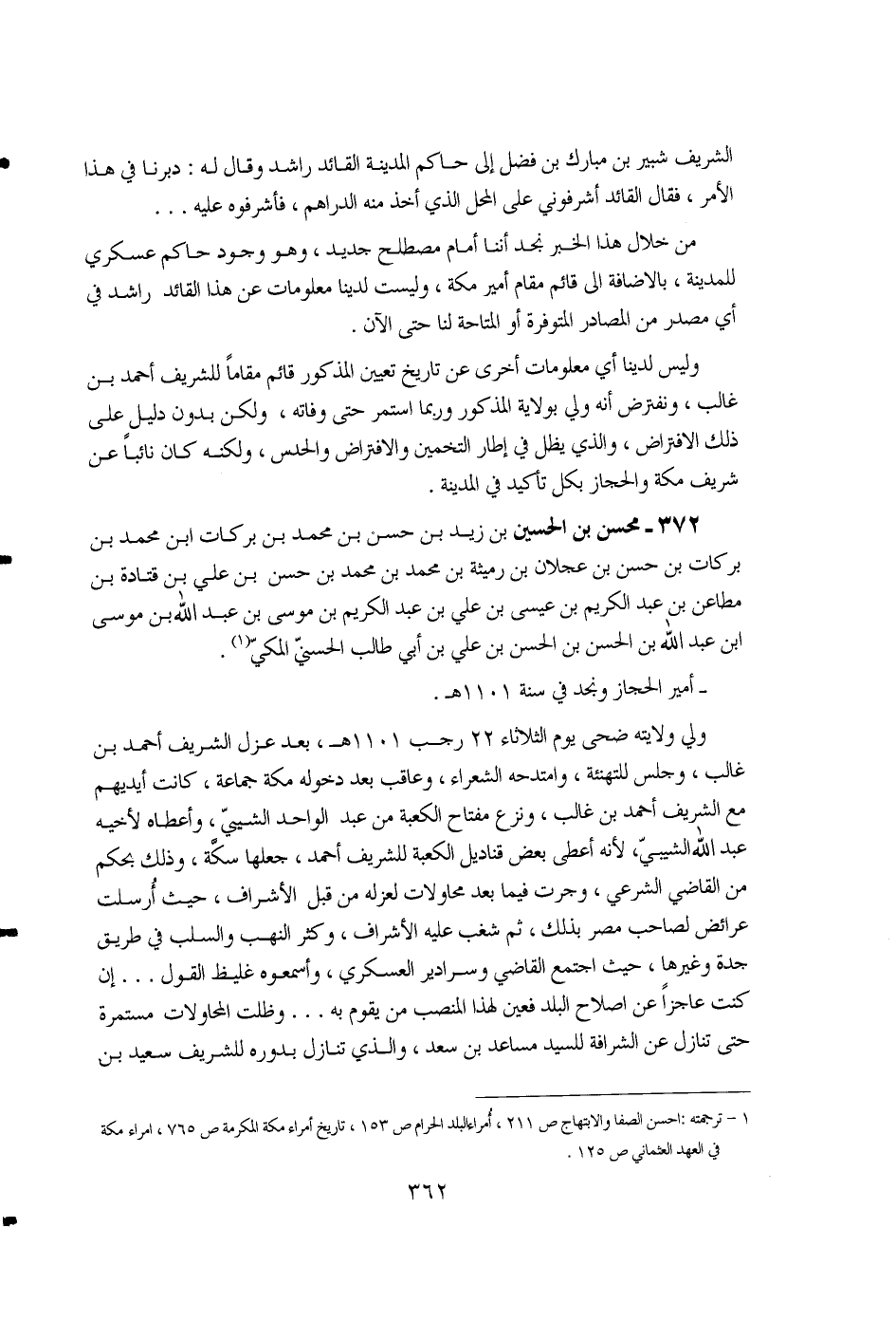 1 - ترجمته: احسن الصفا والابتهاج ص211، أمراء البلد الحرام ص153، تاريخ أمراء مكة المكرمة ص765، أمراء مكة في العهد العثماني ص125.