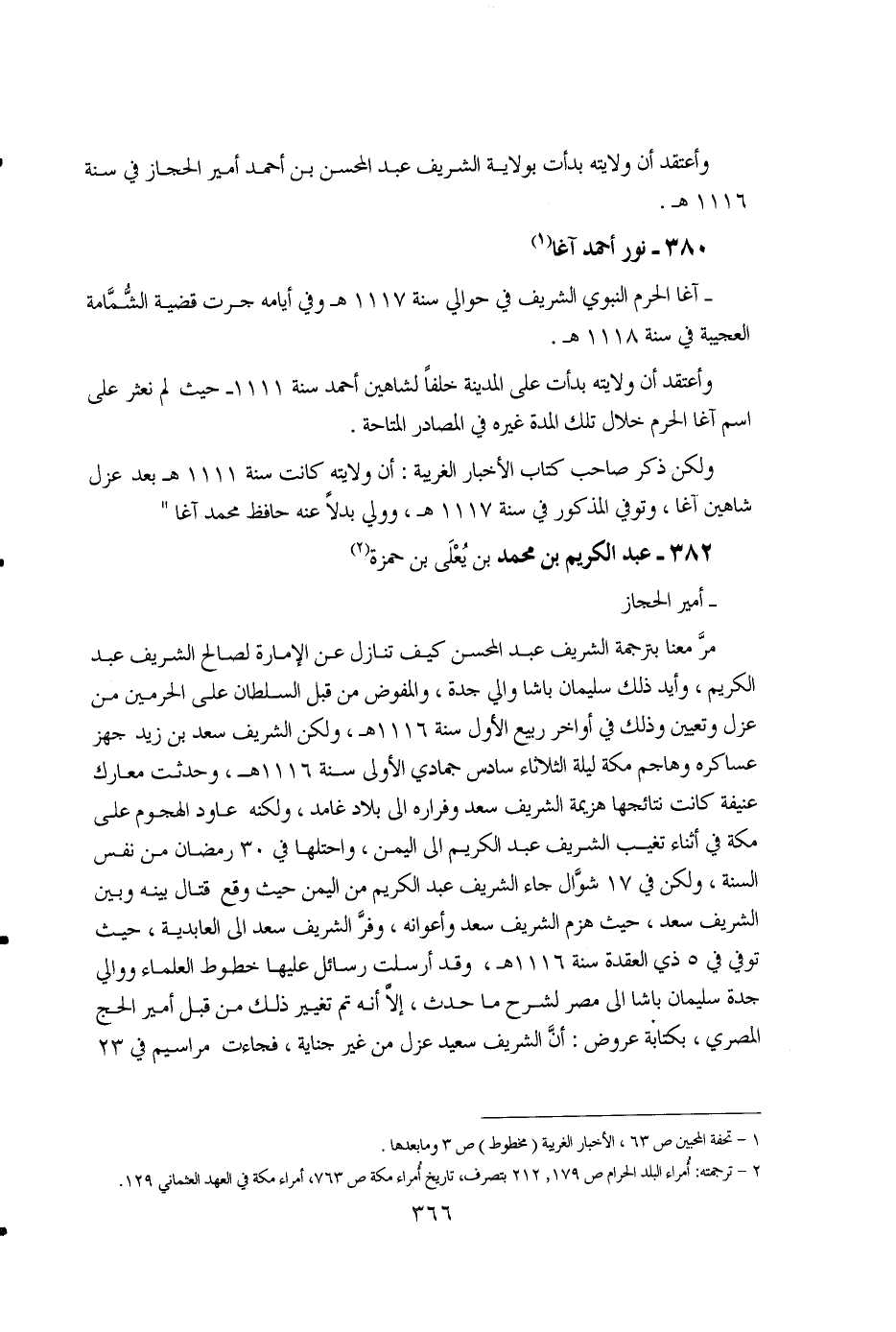 366 ... وأعتقد أن ولايته بدأت بولاية الشريف عبد المحسن بن أحمد أمير الحجاز في سنة1116هـ.