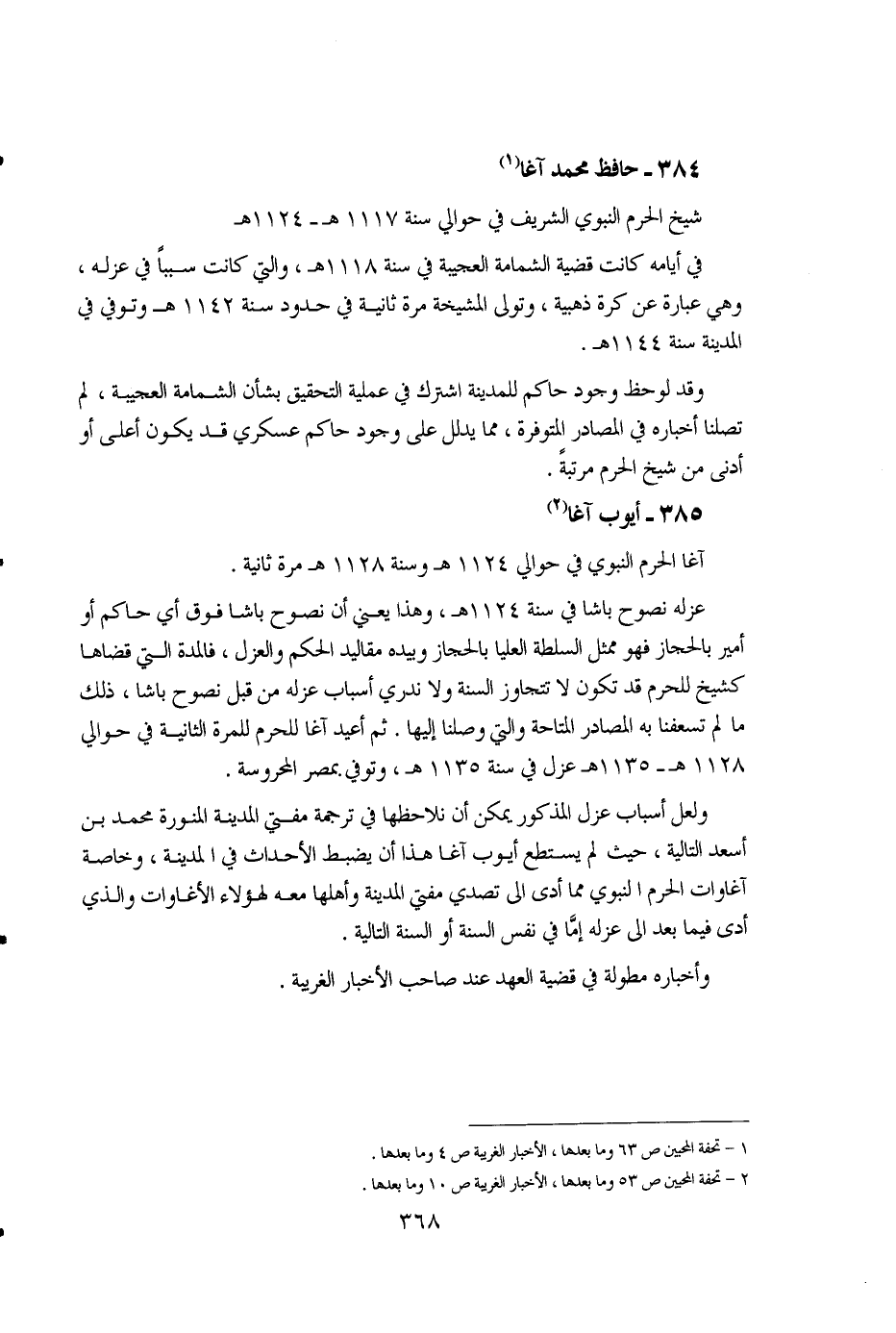 384 - حافظ محمد آغا (1) شيخ الحرم النبوي الشريف في حوالي سنة 1117هـ - 1124هـ في أيامه كانت قضية الشمامة العجيبة في سنة 1118هـ، والتي كانت سبباً في عزله، وهي عبارة عن كرة ذهبية، وتولى المشيخة مرة ثانية في حدود سنة 1142هـ وتوفي في المدينة سنة 1144هـ. وقد لوحظ وجود حاكم للمدينة اشترك في عملية التحقيق بشأن الشمامة العجيبة، لم تصلنا أخباره في المصادر المتوفرة، مما يدلل على وجود حاكم عسكري قد يكون أعلى أو أدنى من شيخ الحرم مرتبةً.