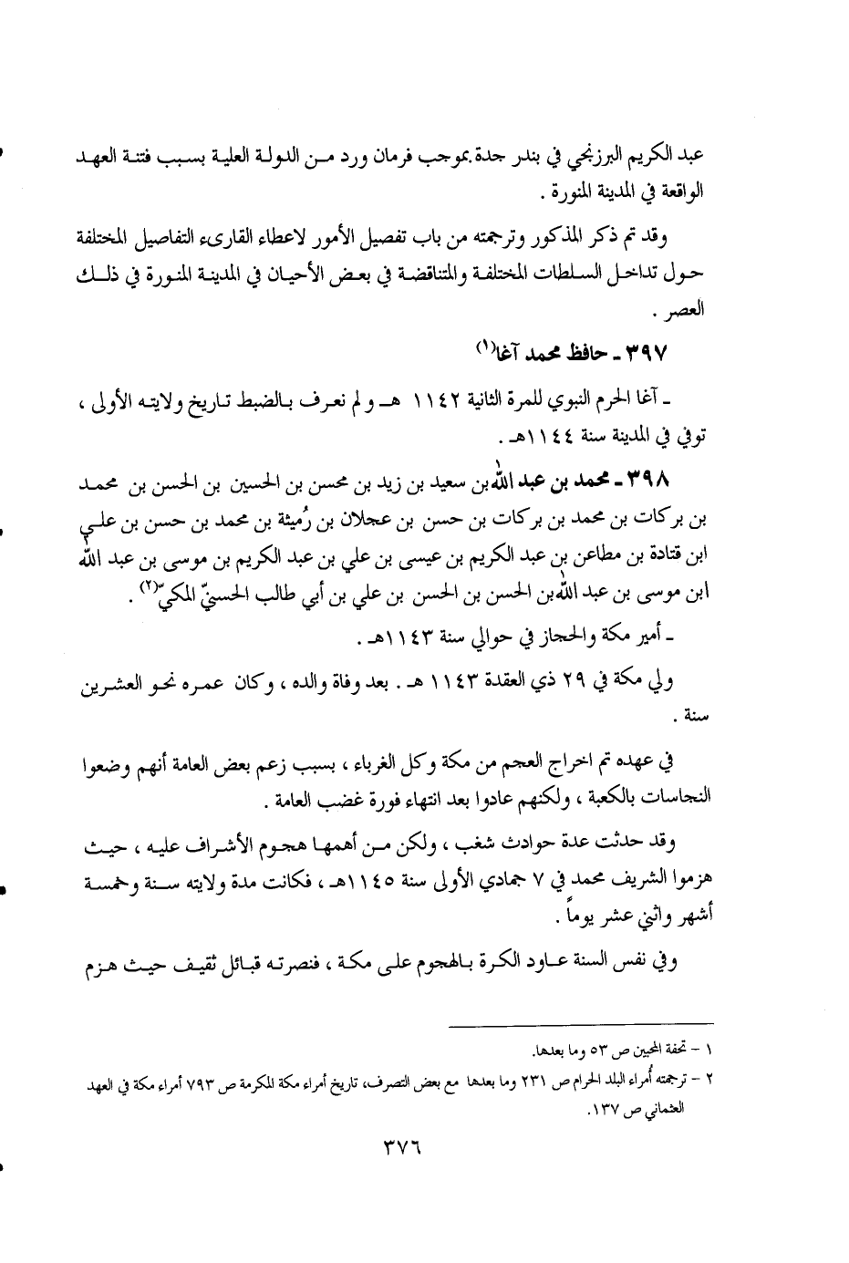 376 ... عبد الكريم البرزنجي في بندر جدة بموجب فرمان ورد من الدولة العلية بسبب فتنة العهد الواقعة في المدينة المنورة. وقد تم ذكر المذكور وترجمته من باب تفصيل الأمور لإعطاء القارئ التفاصيل المختلفة حول تداخل السلطات المختلفة والمتناقضة في بعض الأحيان في المدينة المنورة في ذلك العصر.