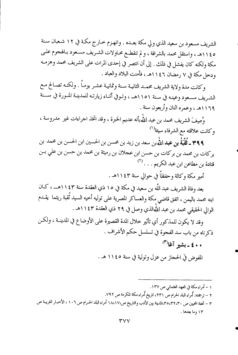 377 ... الشريف مسعود بن سعيد الذي ولي مكة بعده. وانهزم خارج مكة في 12 شعبان سنة 1145هـ، واستقل محمد بالشرافة، ولم تنقطع محاولات الشريف مسعود بالهجوم على مكة ولكنه كان يفشل في ذلك. إلى أن انتصر في إحدى المرات على الشريف محمد وهزمه ودخل مكة في 7 رمضان 1146هـ، فأمنت البلاد والعباد. وكانت مدة ولاية الشريف محمد الثانية سنة وثمانية عشر يوماً. ولكنه تصالح مع الشريف مسعود وعينه في سنة 1151هـ، وتوفي أثناء زيارته للمدينة المنورة في سنة 1169هـ، وعمره اثنان وأربعون سنة. وصف الشريف محمد بن عبد الله بأنه عديم الخبرة، وقد اتخذ اجراءات غير مدروسة، وكانت علاقته مع الشرفاء سيئة (1)