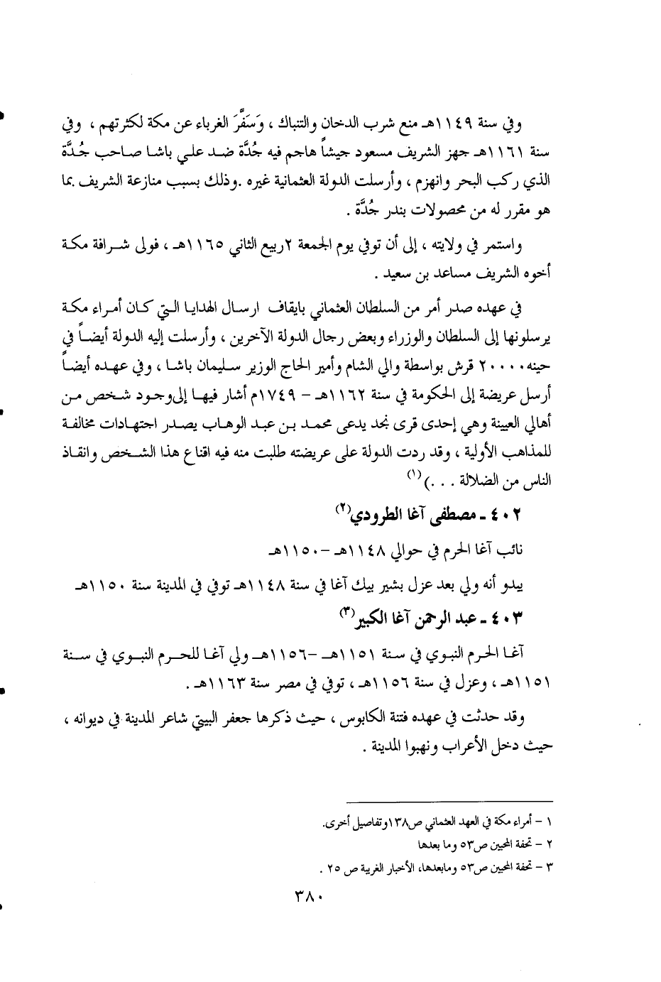 380 ... وفي سنة 1149هـ منع شرب الدخان والتنباك، وسفر الغرباء عن مكة لكثرتهم، وفي سنة 1161هـ جهز الشريف مسعود جيشاً هاجم فيه جدة ضد علي باشا صاحب جده الذي ركب البحر وانهزم، وأرسلت الدولة العثمانية غيره. وذلك بسبب منازعة الشريف بما هو مقرر له من محصولات بندر جدة. واستمر في ولايته، إلى أن توفي يوم الجمعة 2 ربيع الثاني 1165هـ، فولى شرافة مكة أخوه الشريف مساعد بن سعيد. في عهده صدر أمر من السلطان العثماني بإيقاف إرسال الهدايا التي كان أمراء مكة يرسلونها إلى السلطان والوزراء وبعض رجال الدولة الآخرين، وأرسلت إليه الدولة أيضاً في حينه ….20 قرش بواسطة والي الشام وأمير الحاج الوزير سليمان باشا، وفي عهده أيضاً أرسل عريضة إلى الحكومة في سنة 1162هـ- 1749م أشار فيها إلى وجود شخص من أهالي العيينة وهي إحدى قرى نجد يدعى محمد بن عبد الوهاب يصدر اجتهادات مخالفة للمذاهب الأولية، وقد ردت الدولة على عريضته طلبت منه فيه إقناع هذا الشخص وإنقاذ الناس من الضلالة .. ) (1).